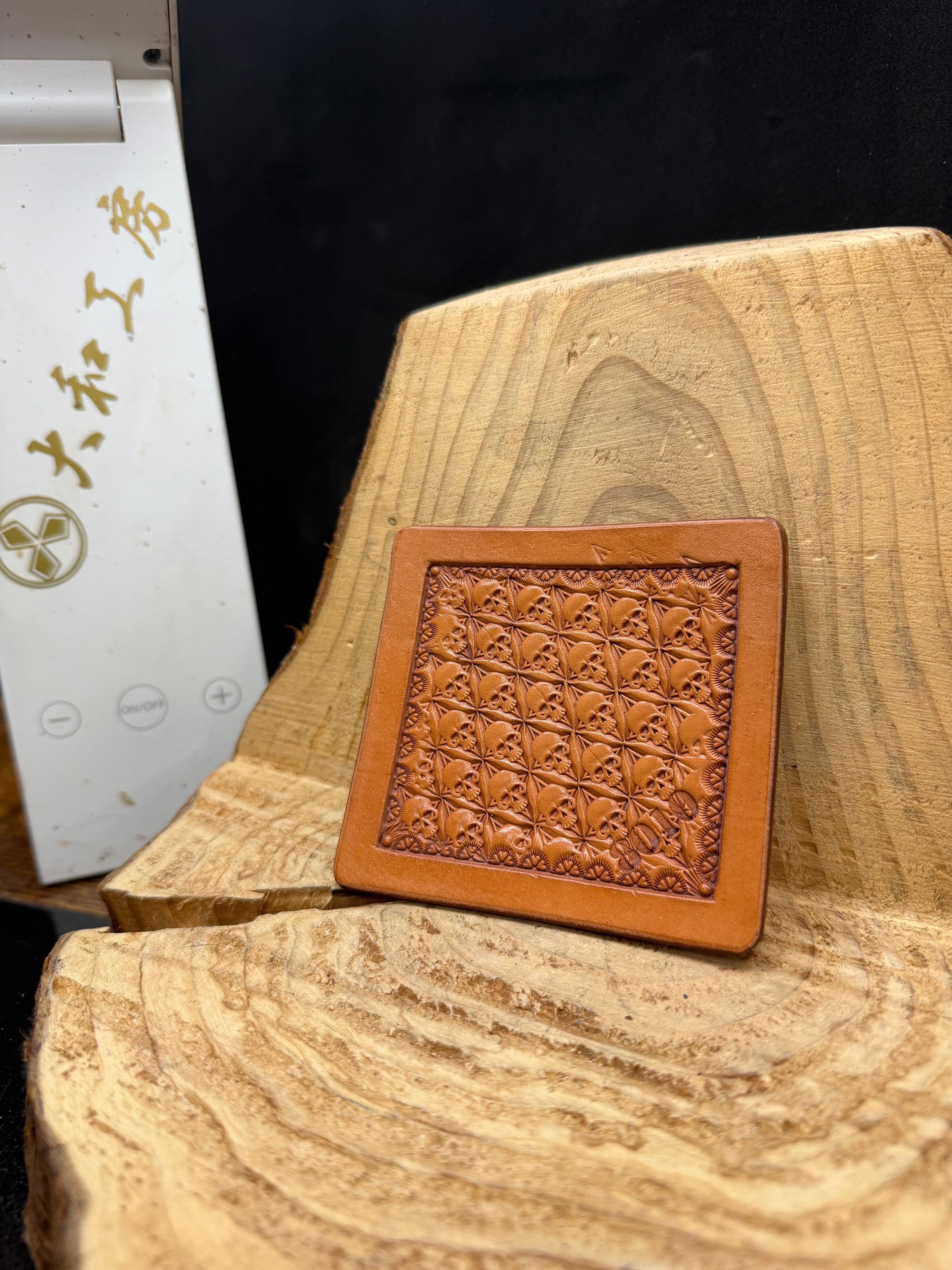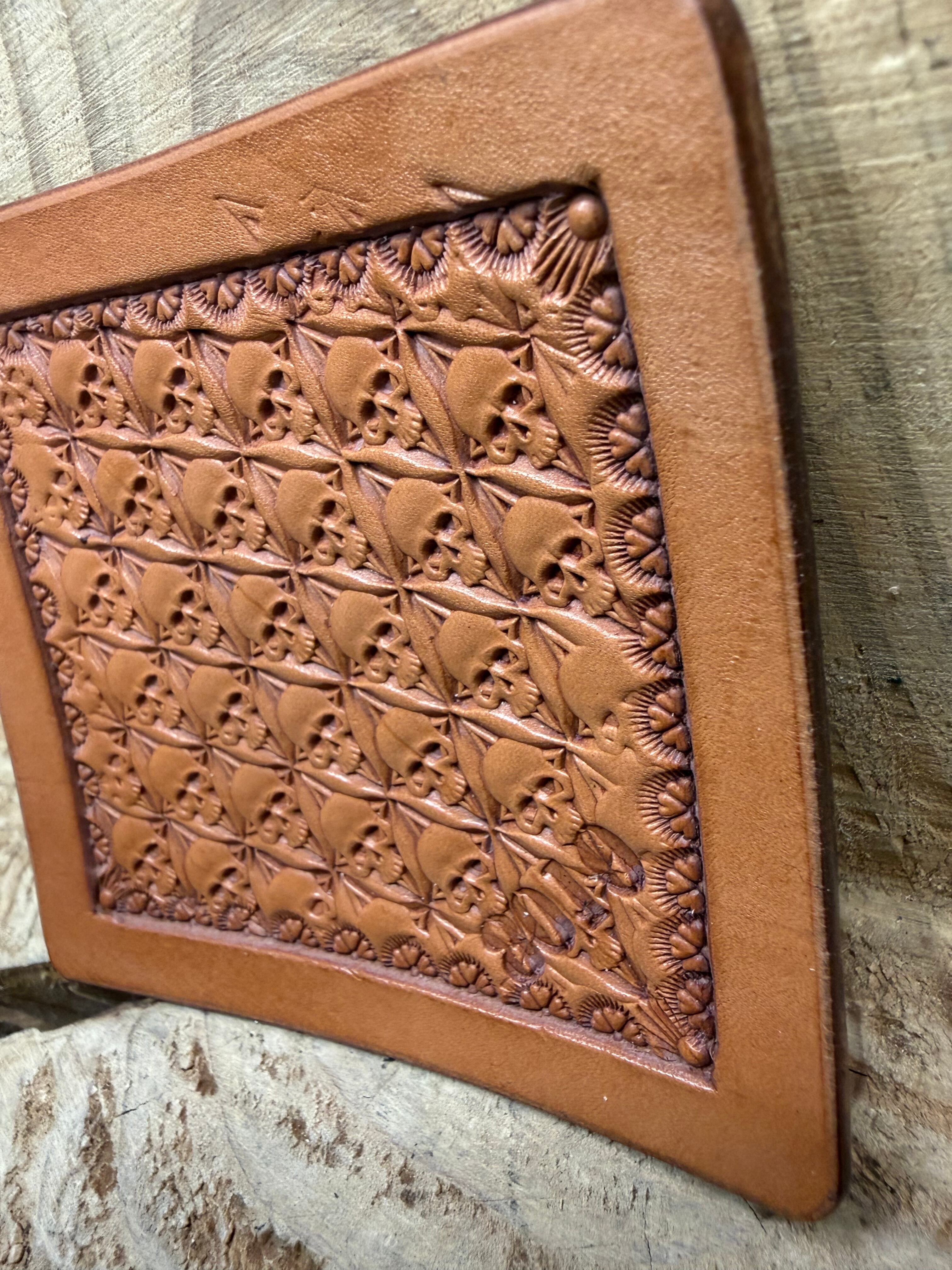レザーカービングコースター中サイズのスカルバスケットの彫り込みです。