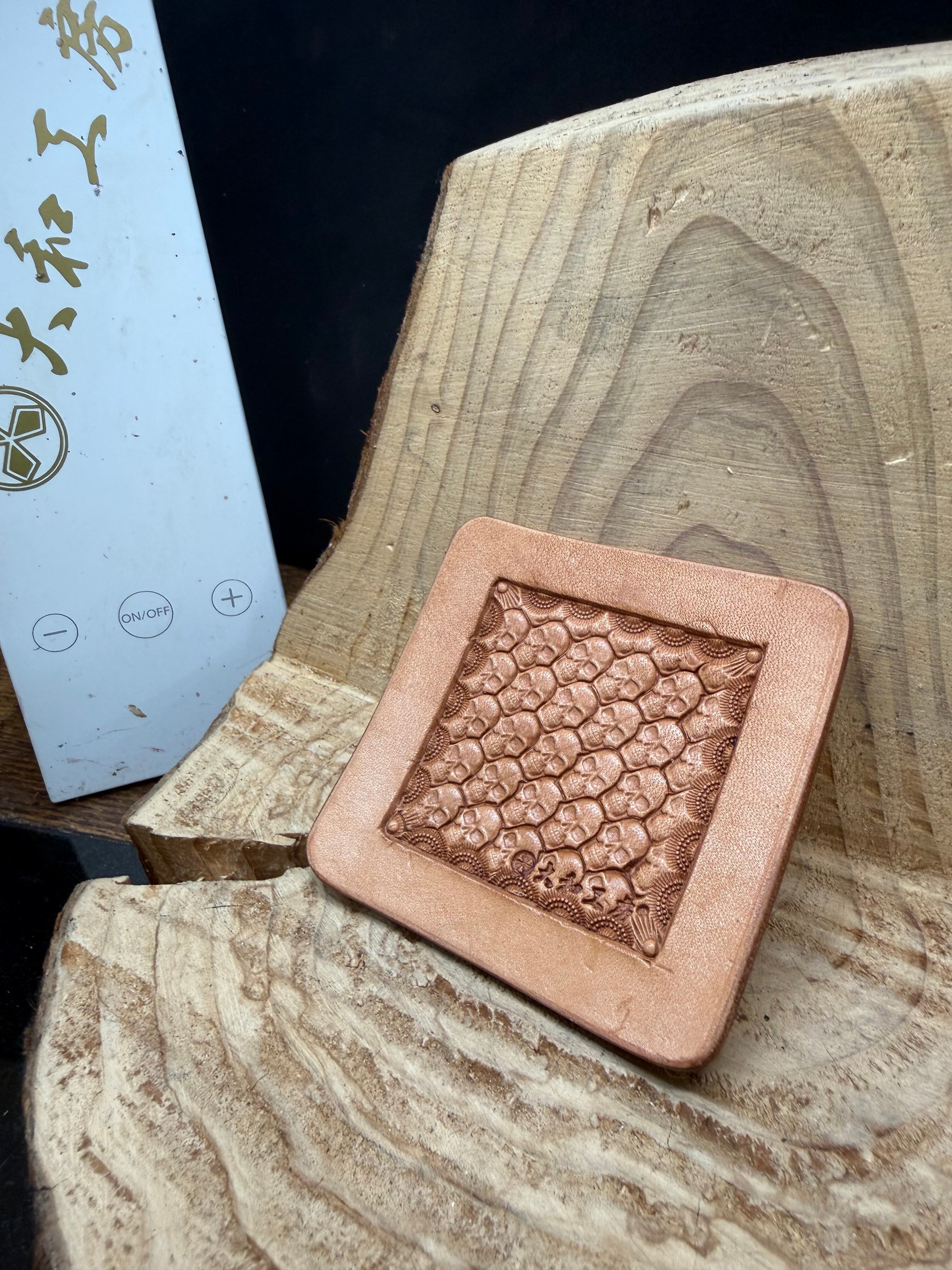 レザーカービングコースター小サイズのスカルバスケットの彫り込みです。