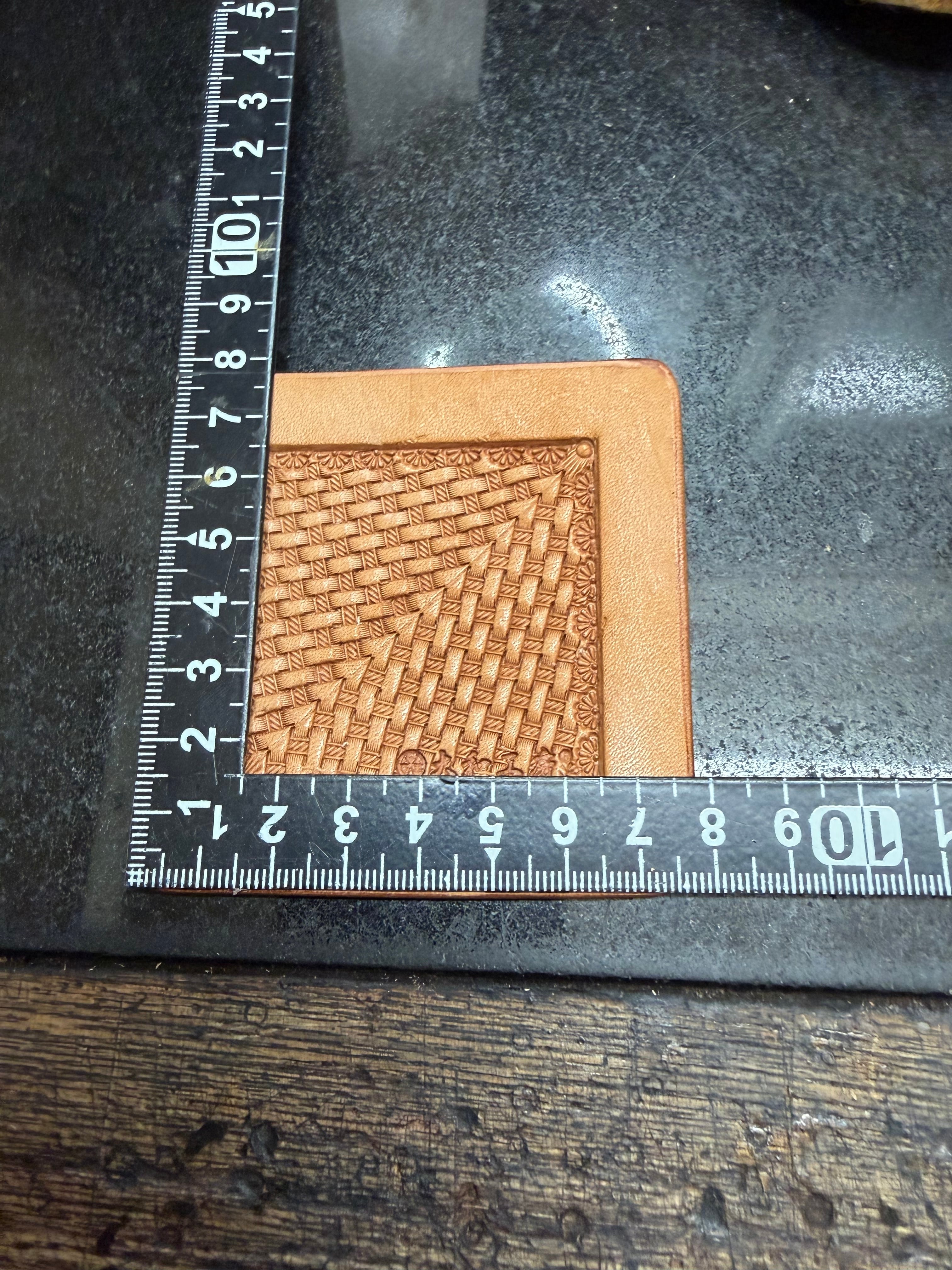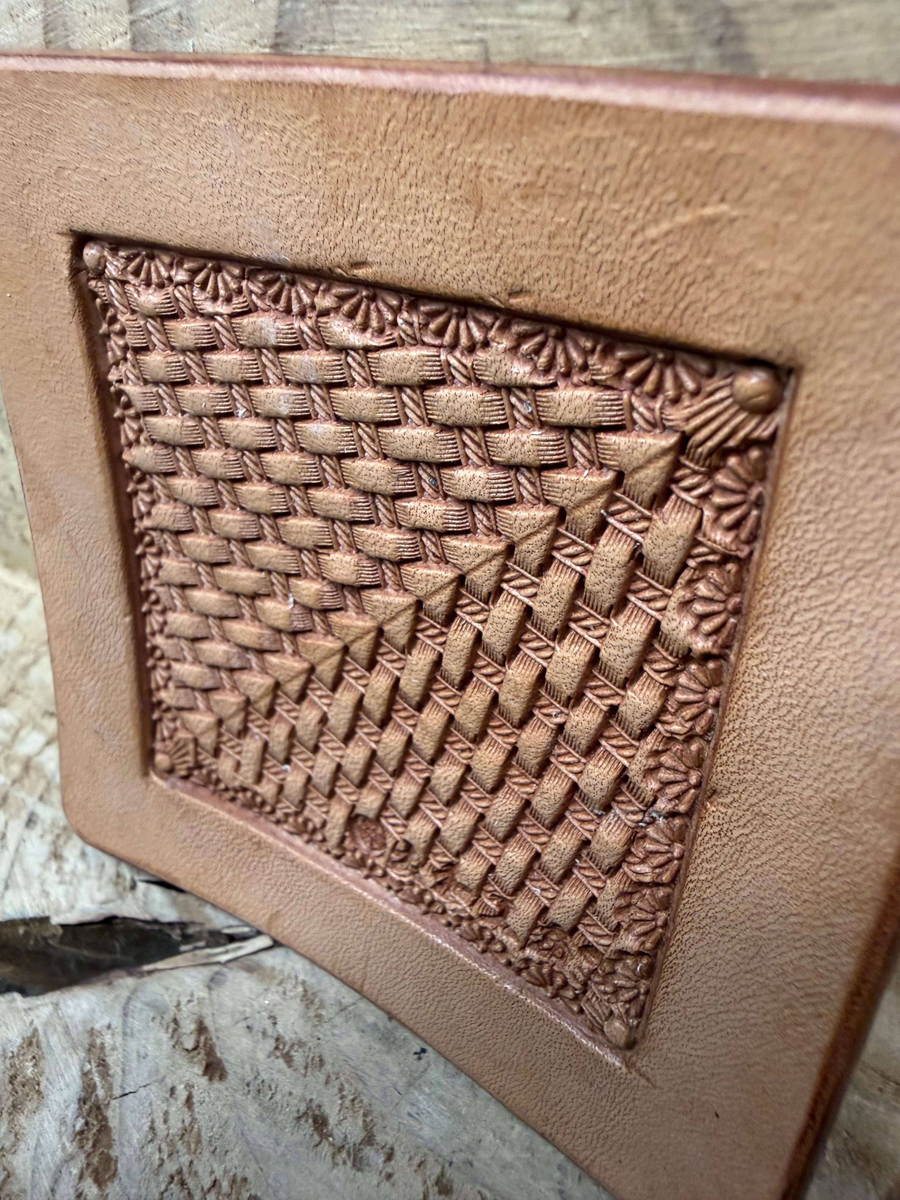 レザーカービングコースター小サイズのスペシャルアローヘッドバスケットの彫り込みです。