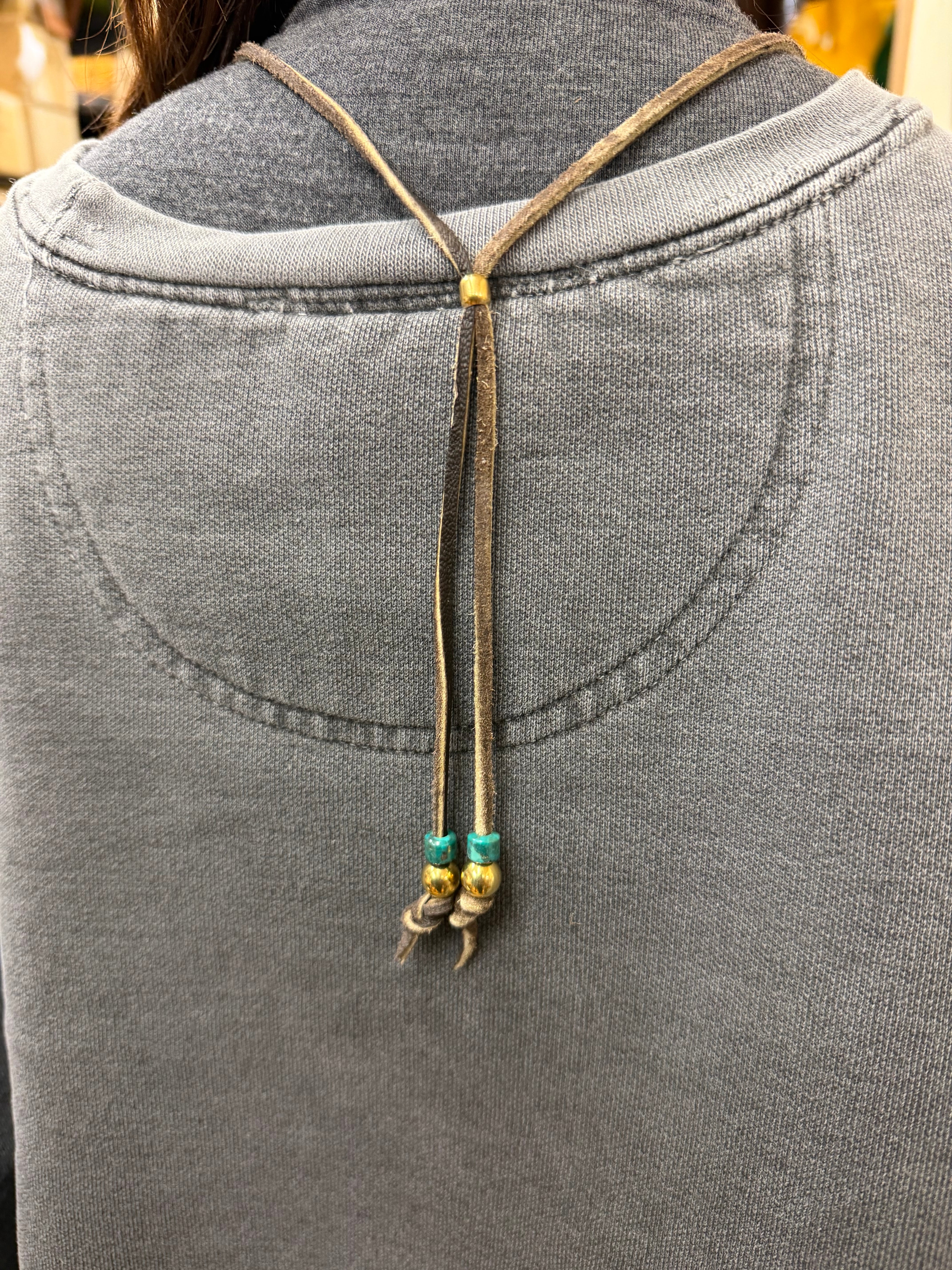 焦茶色の鹿革ひも、ターコイズビーズ、真鍮ビーズにてお仕立てしております。