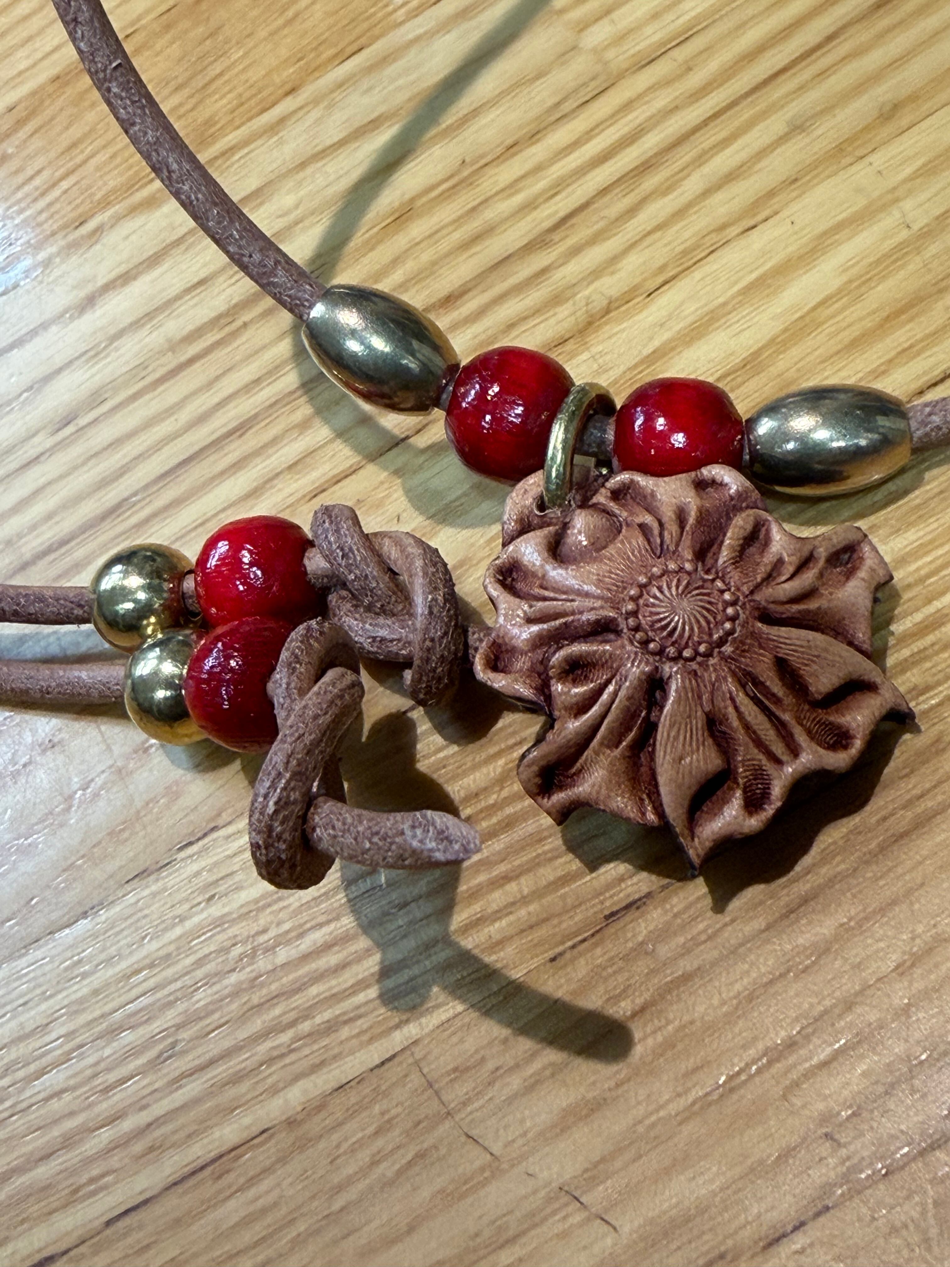 革紐は丸牛革ひも、真鍮ビーズ、ウッドビーズ