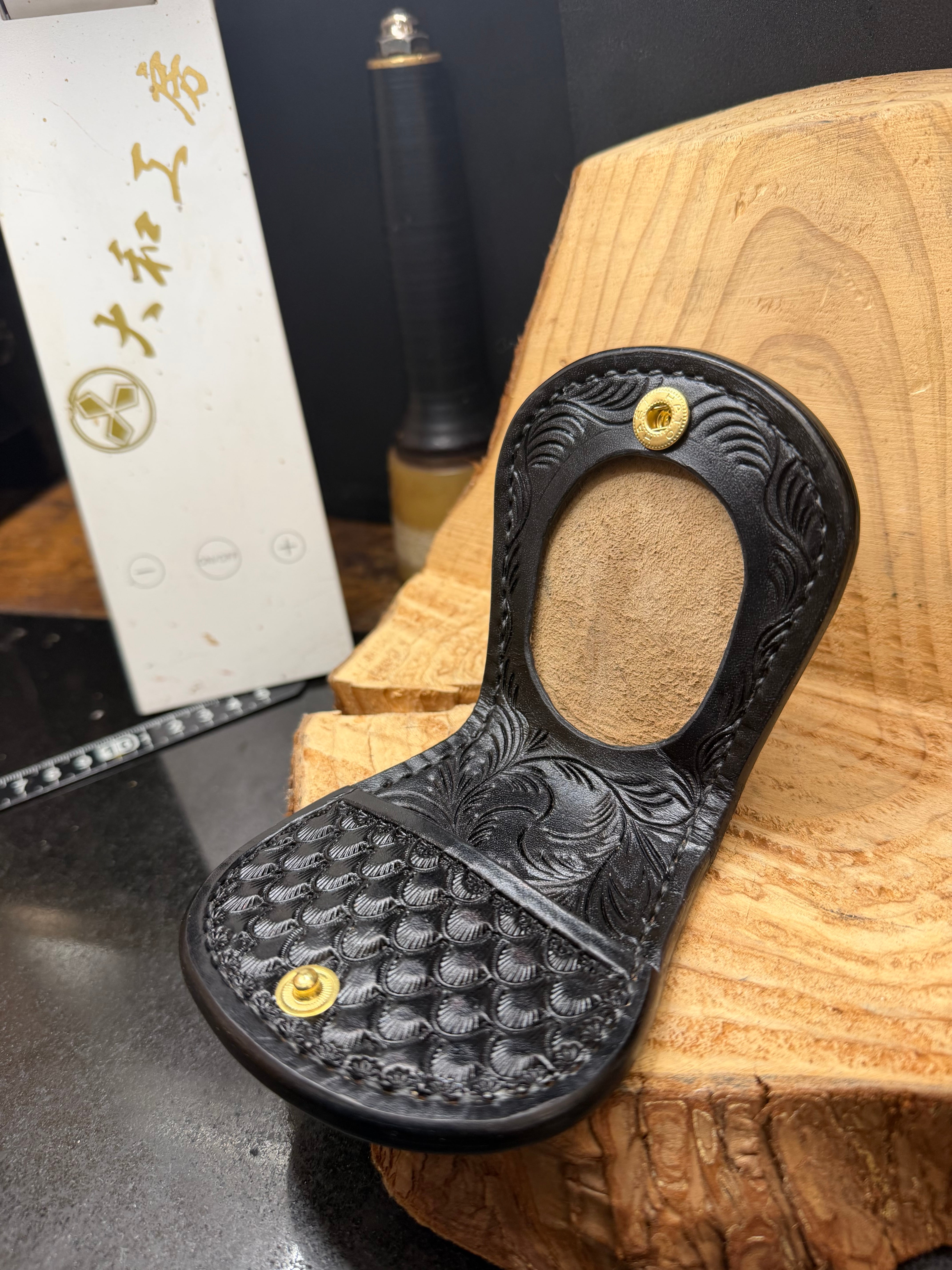 中には蹄鉄にも見えるバスケットを彫り込みオールブラックで仕上げた作品です。