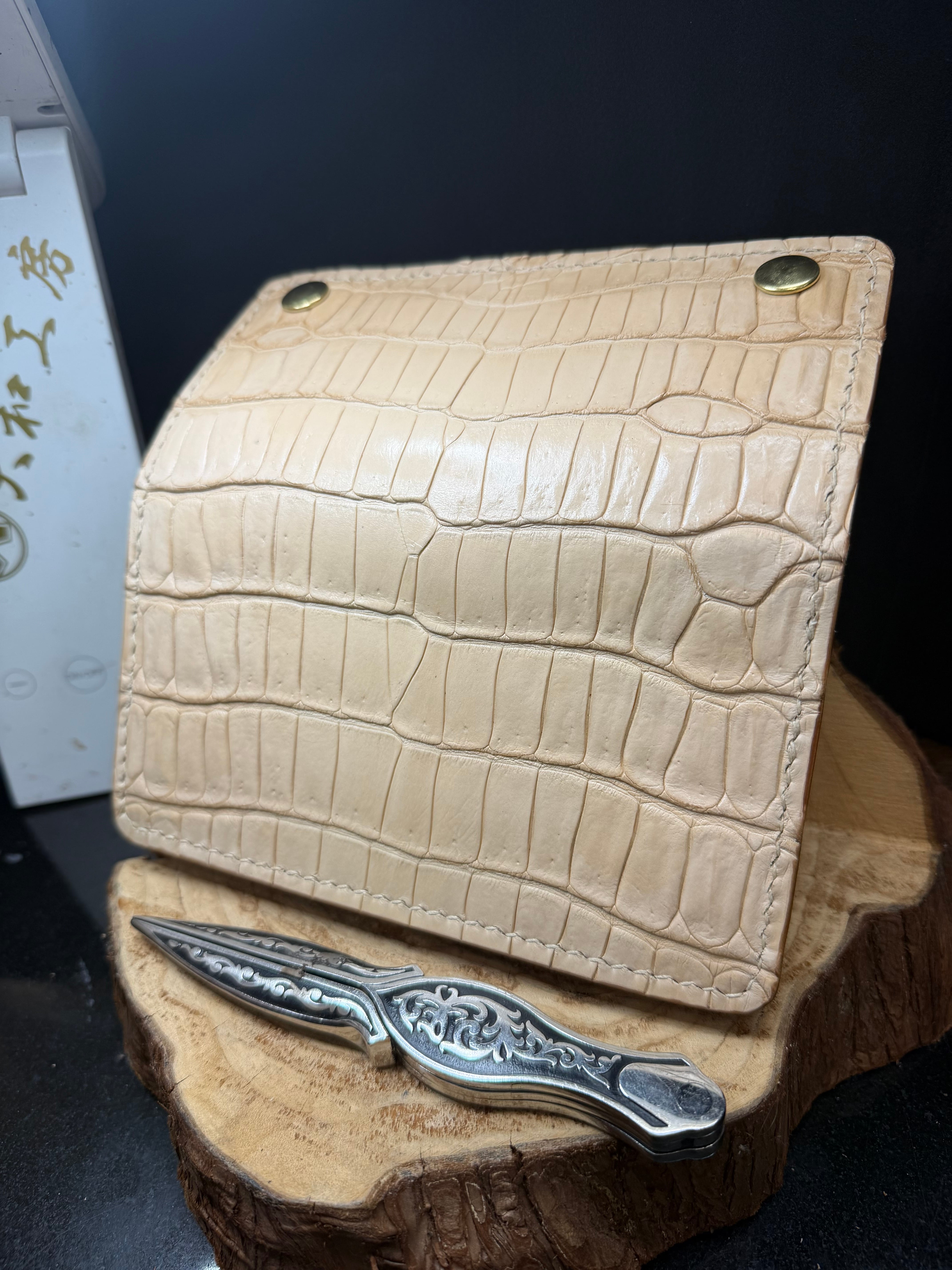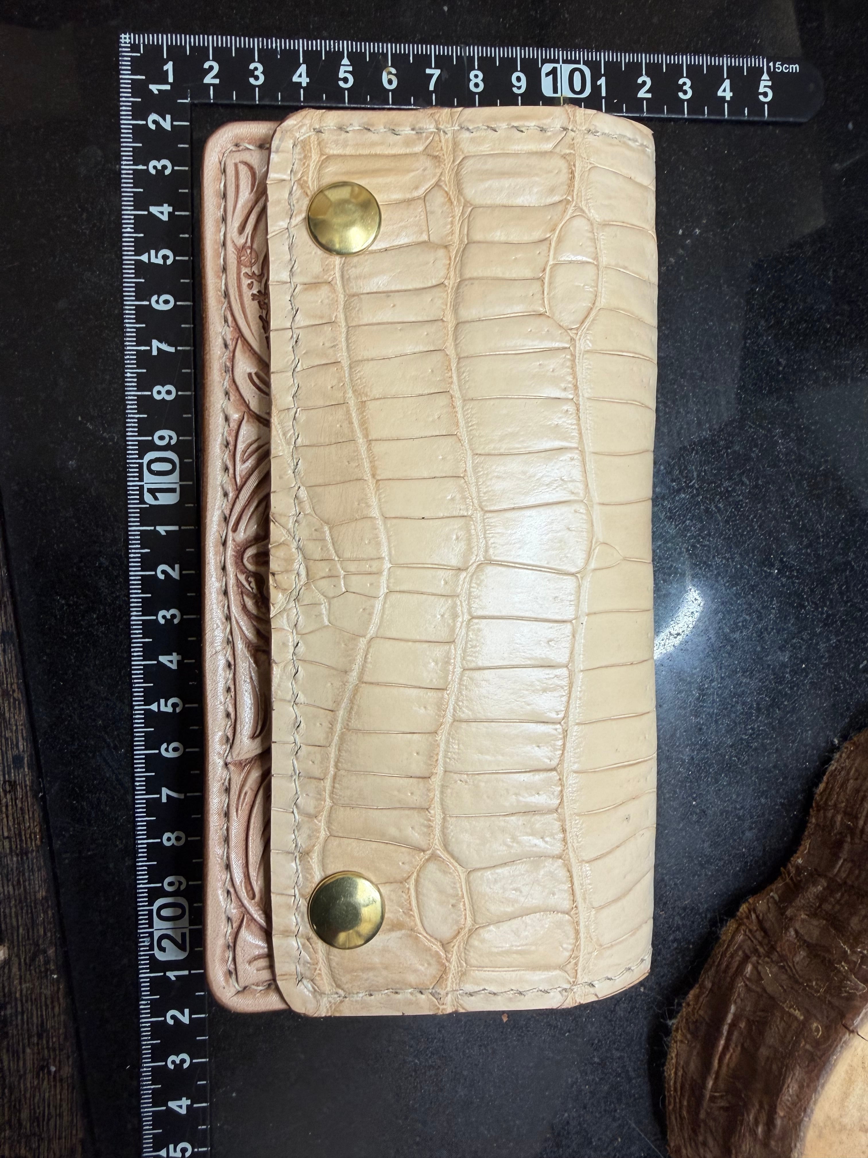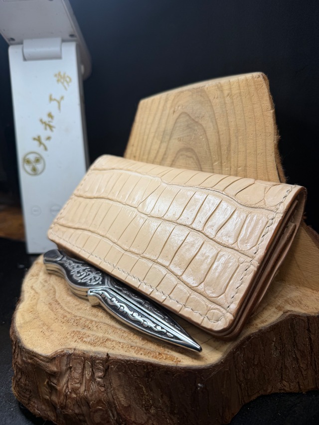 こちらはスモールクロコダイルの尾の部位を使用しているため、もう一つのヌメ革ポロサスのトラッカーズウォレットよりもかなり価格がリーズナブルとなっております。