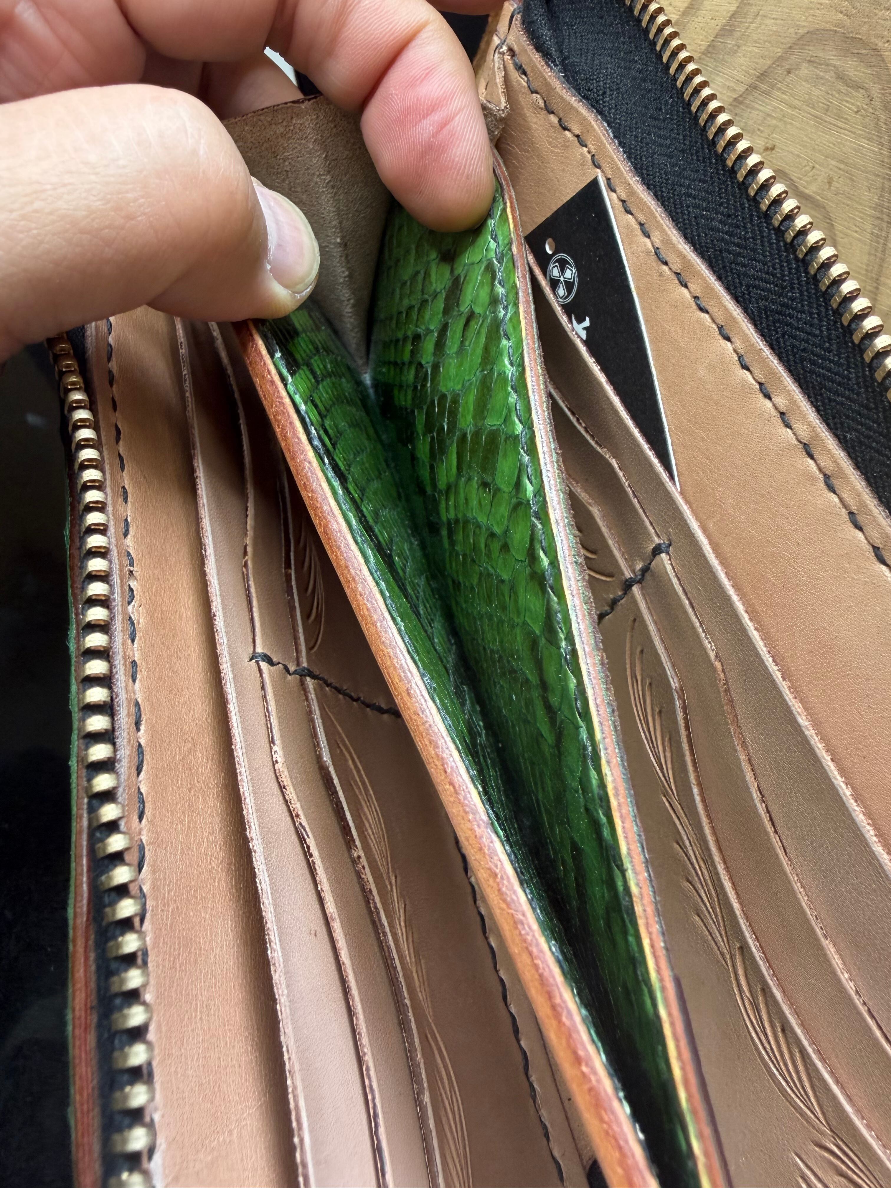 小銭入れ部分にはなんとエンペラーグリーンポロサスとグリーンダイヤモンドパイソンを贅沢に使用!なんとも素晴らしいコンビネーションです。