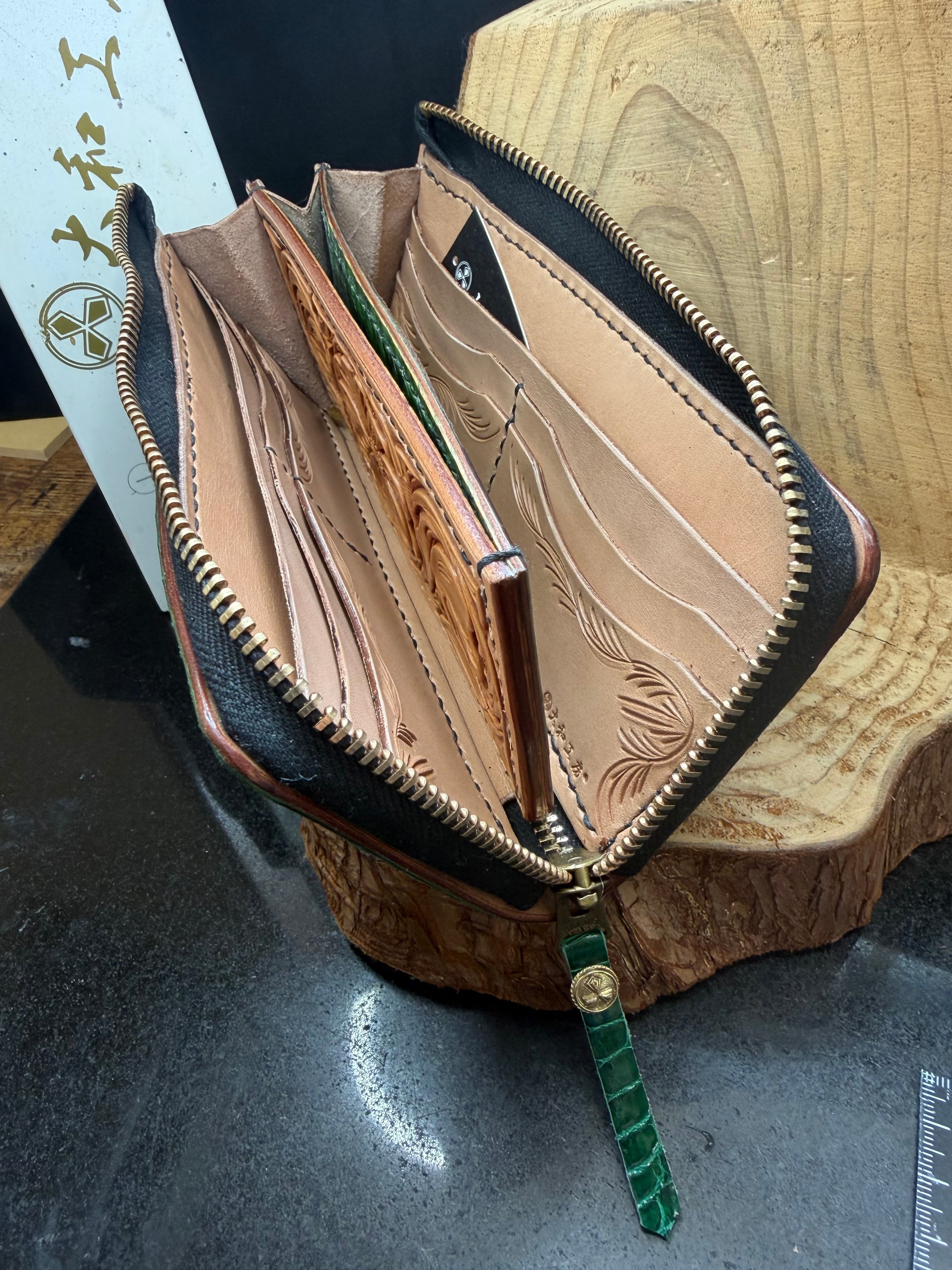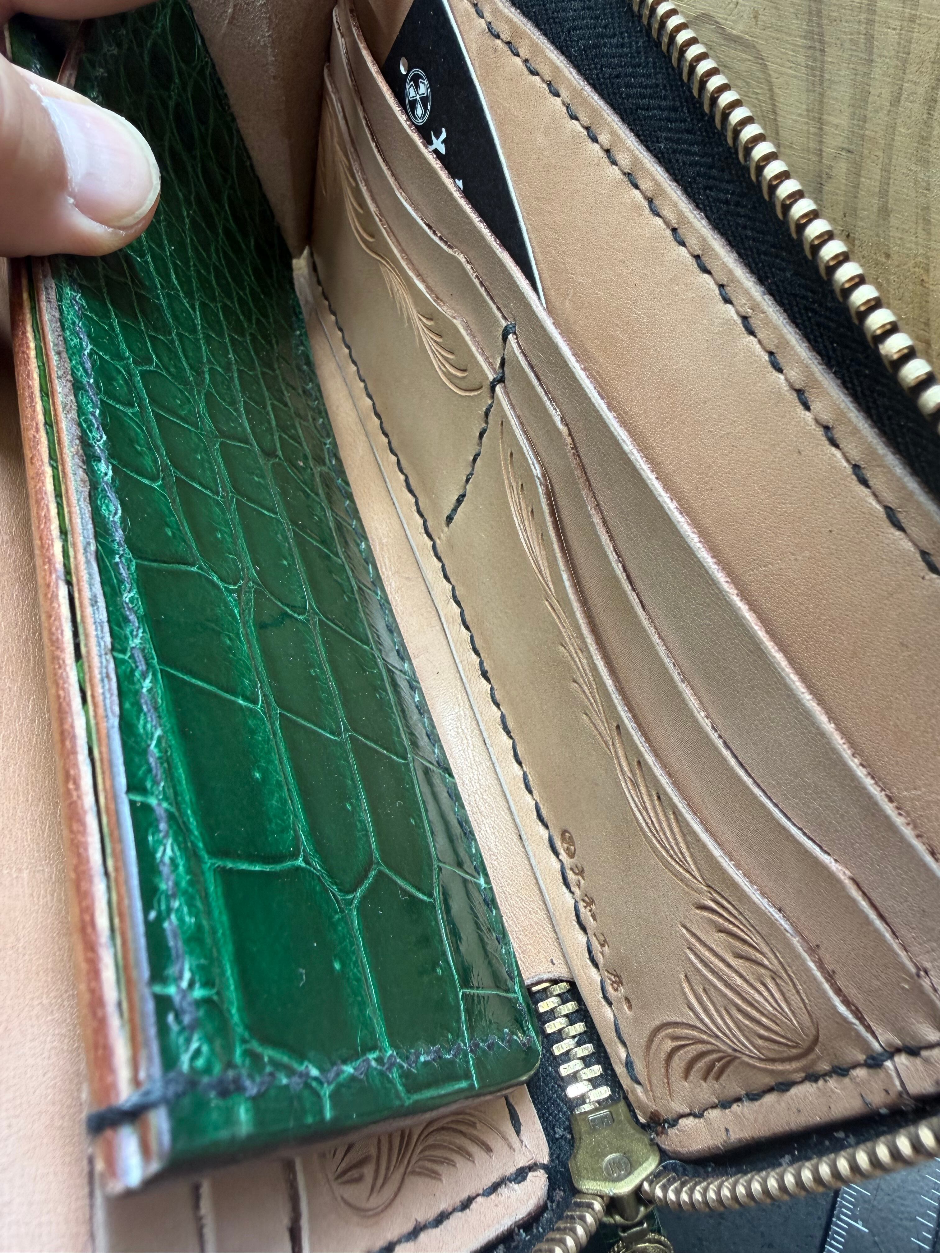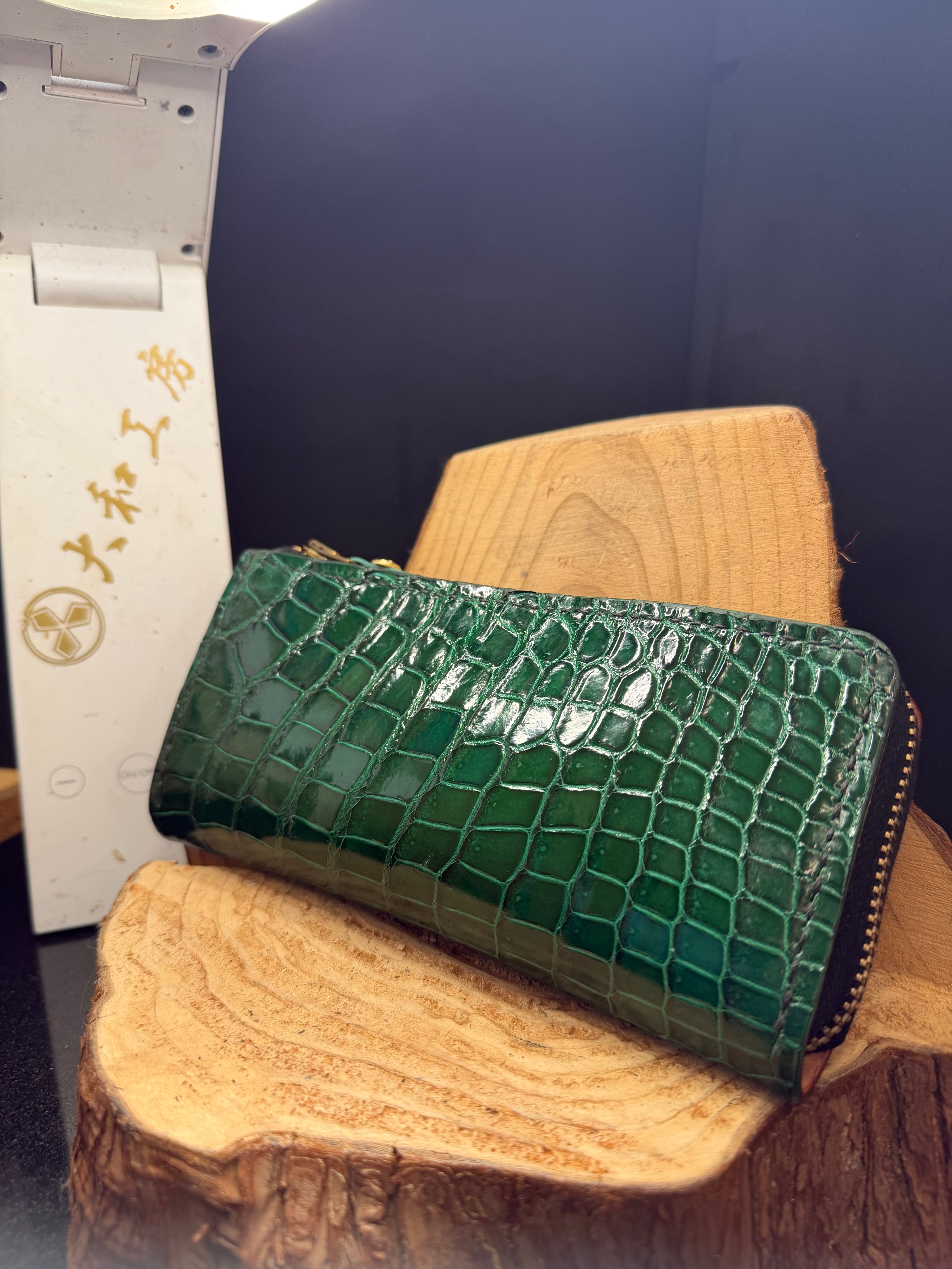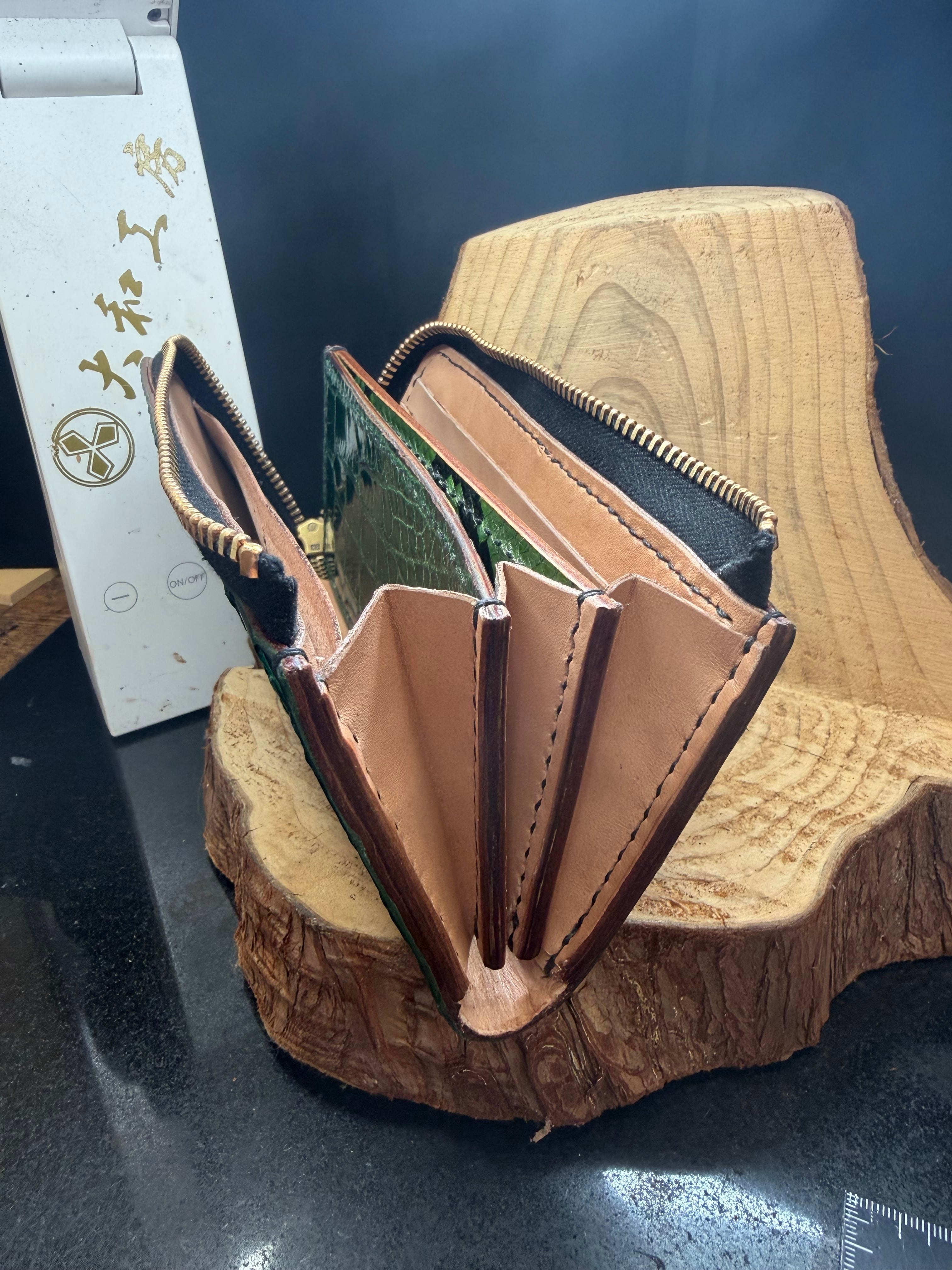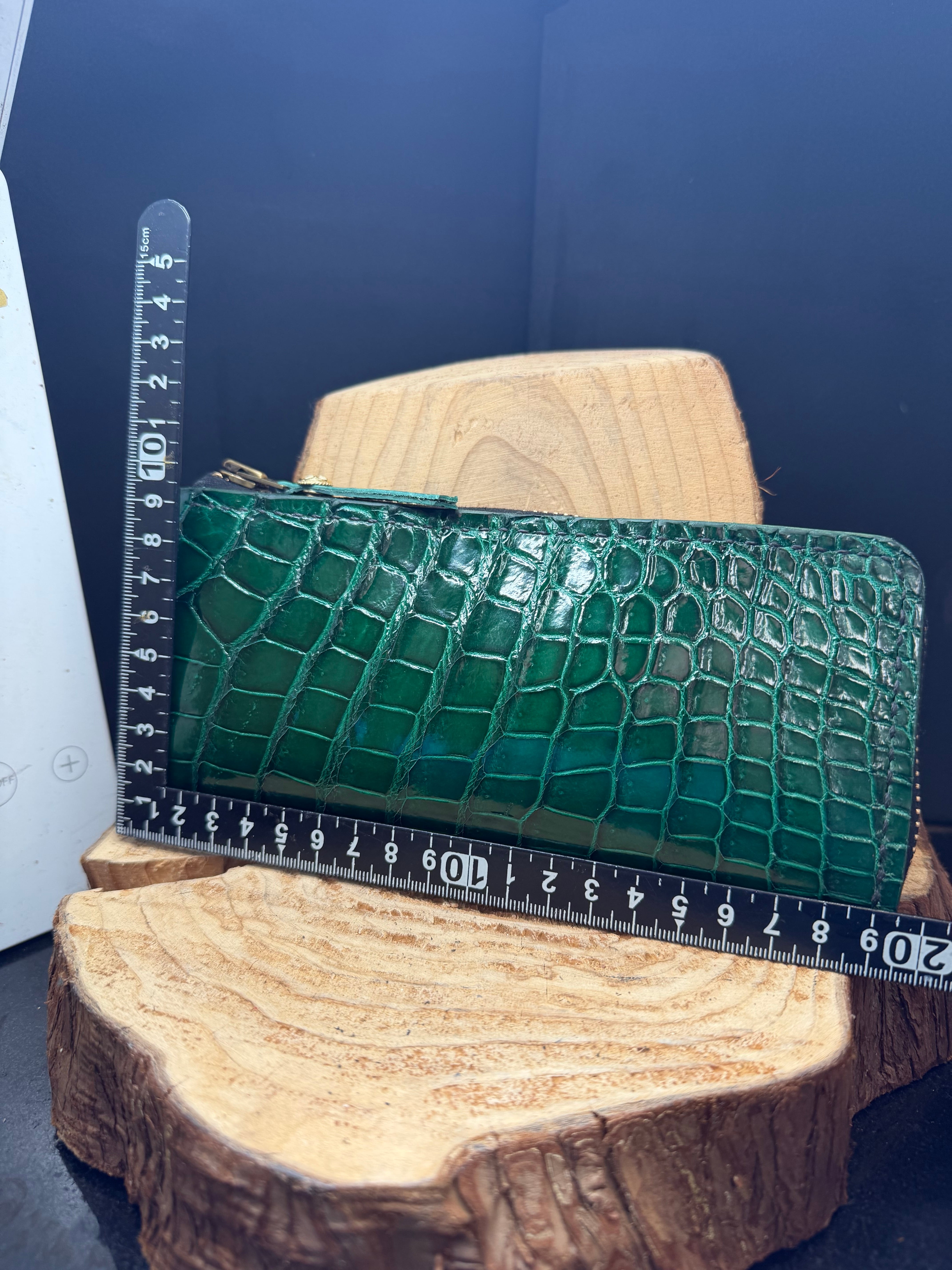 L字ファスナーロングウォレットのグリーン2種ポロサス(スモールクロコダイル)作品です。