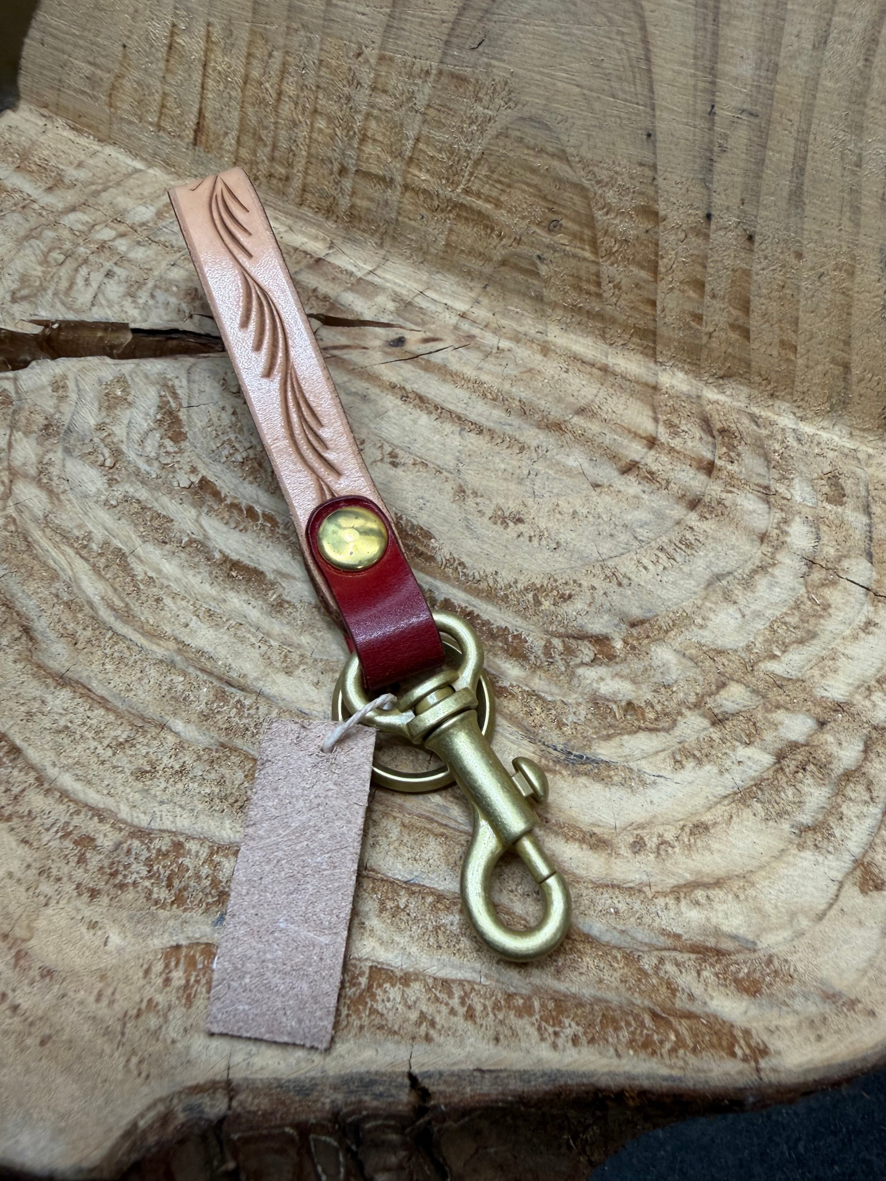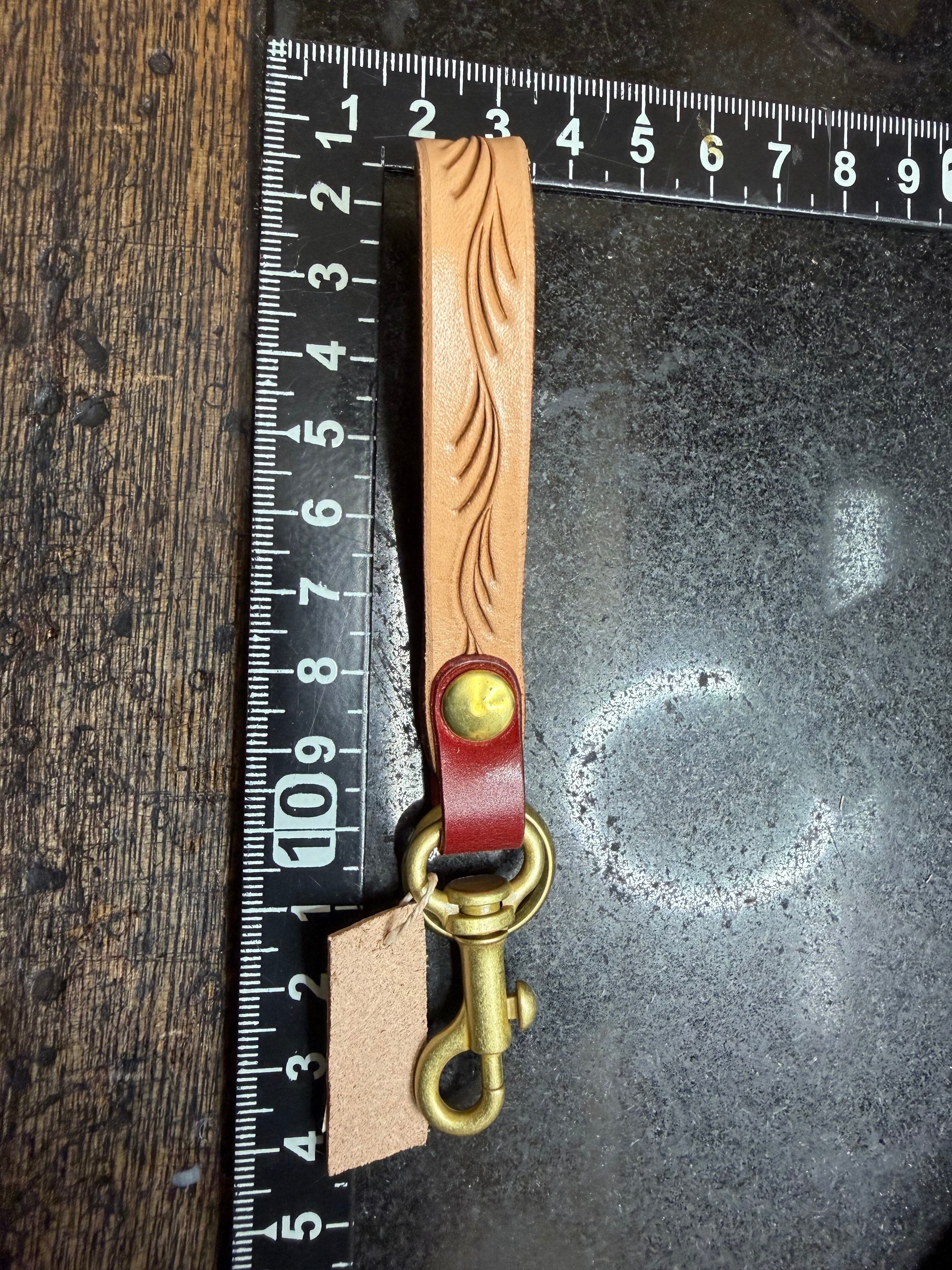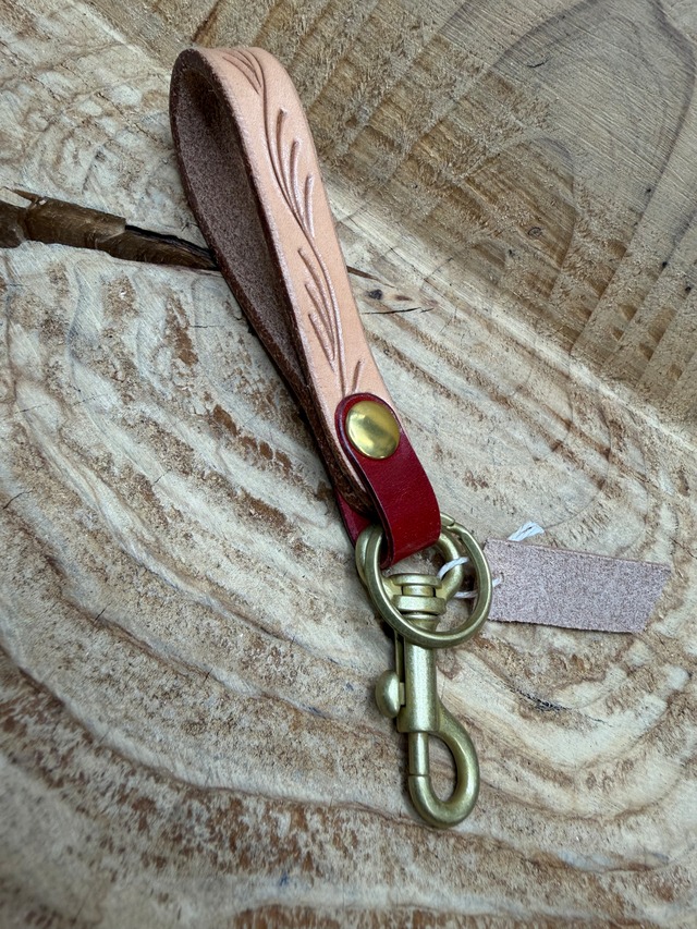数ミリ幅へ、ナイフを用いピンスト唐草を彫り込んだストラップ