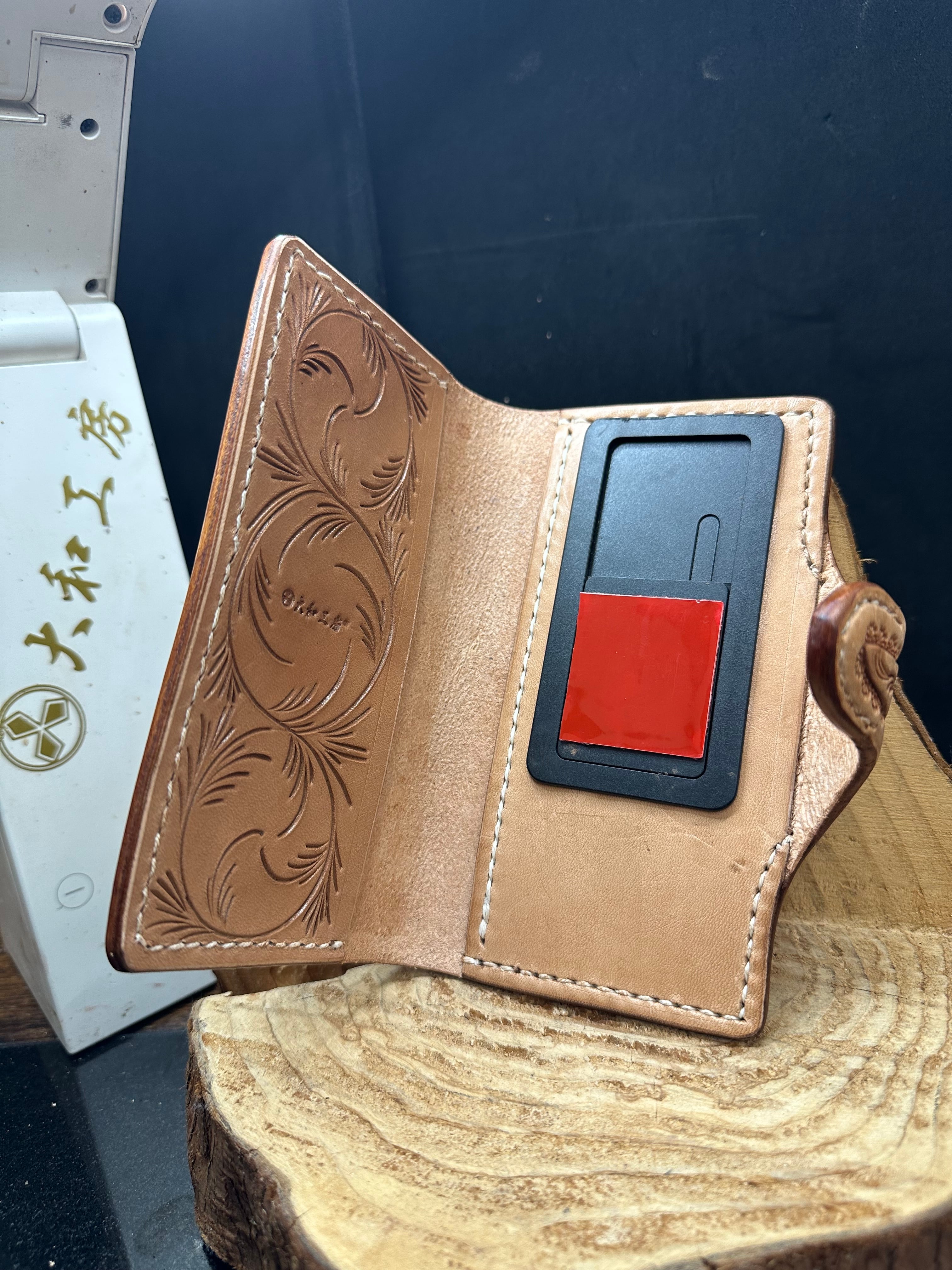 中の携帯を取り付ける部分(両面テープ)下と反対側の唐草を彫り込んだ部分の後ろにカード等を収納できます。。