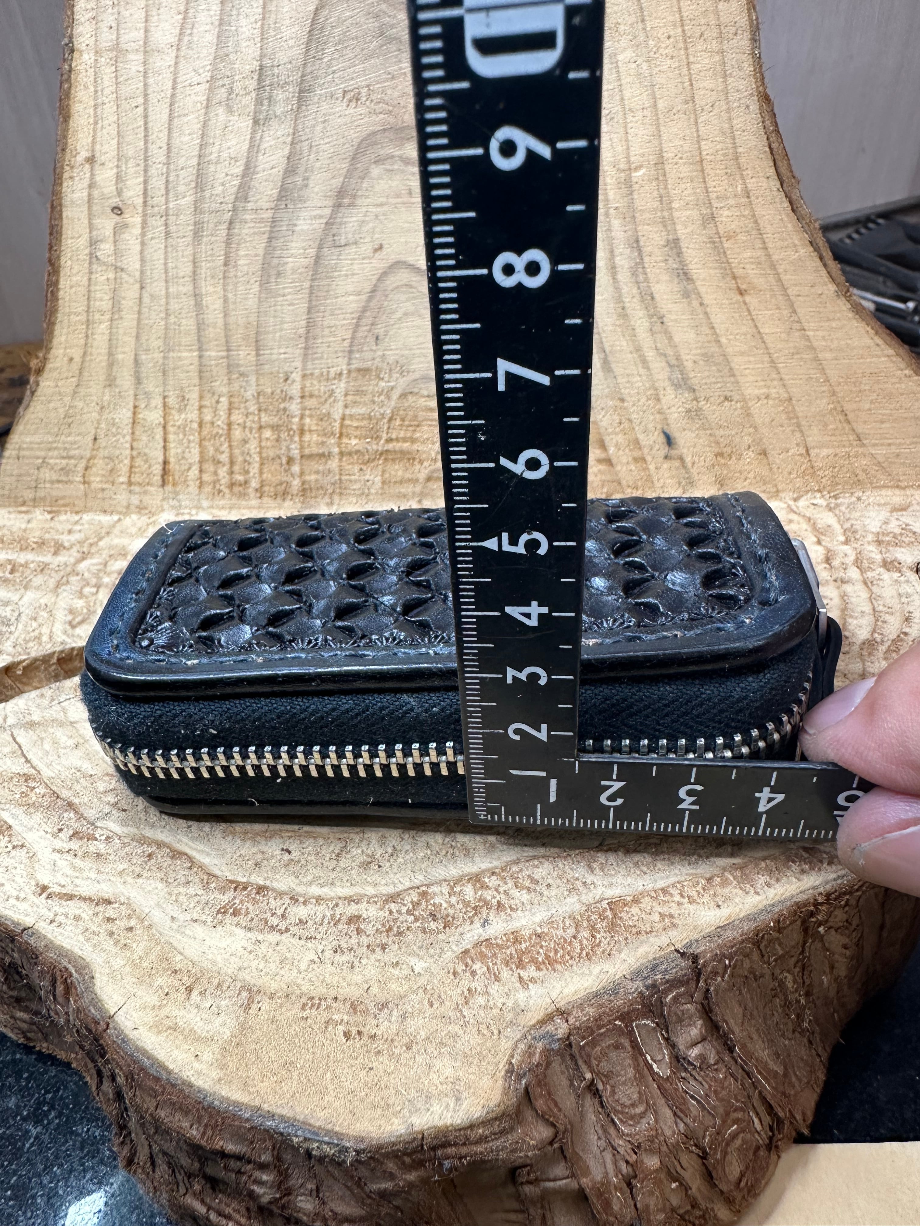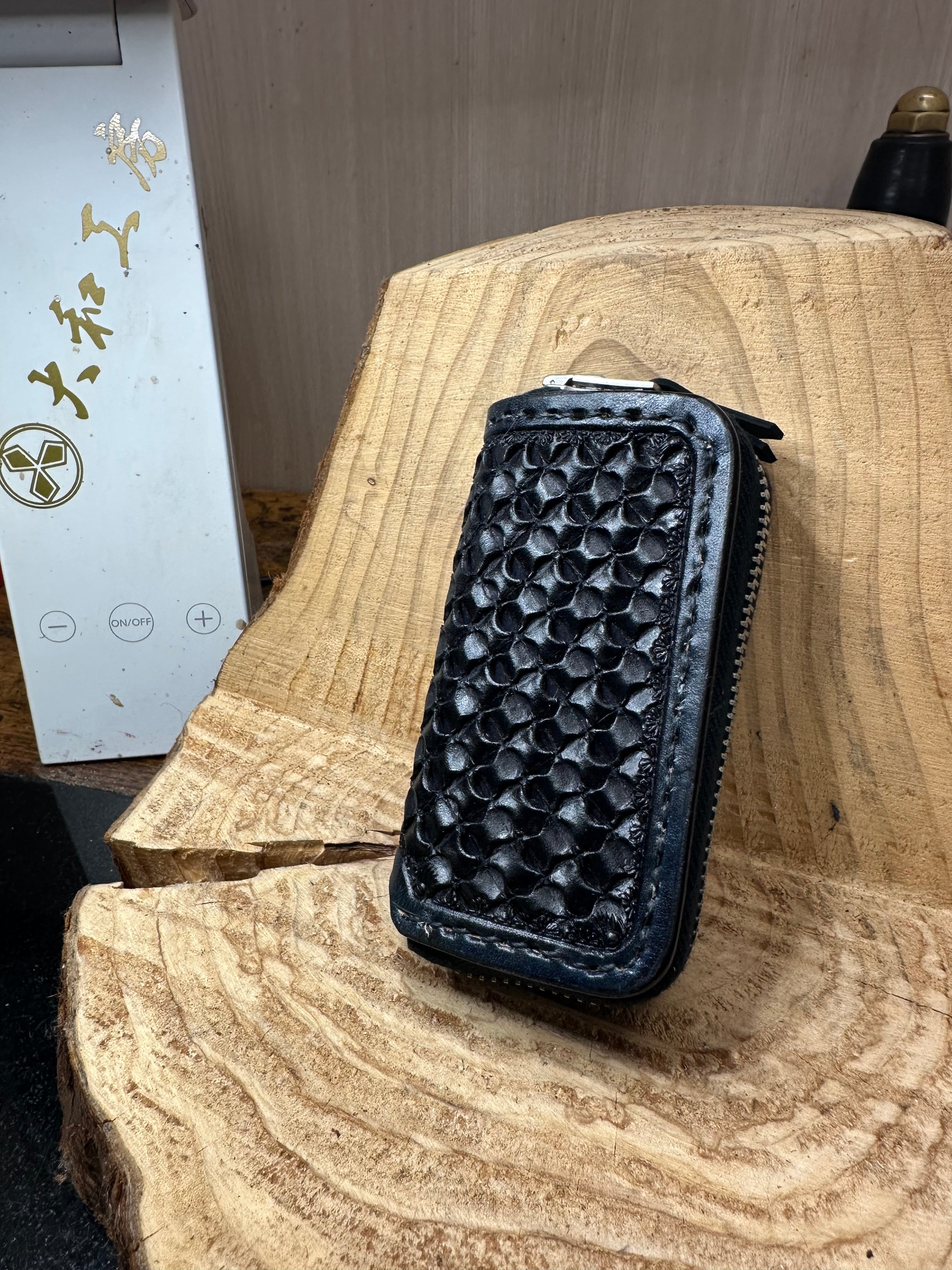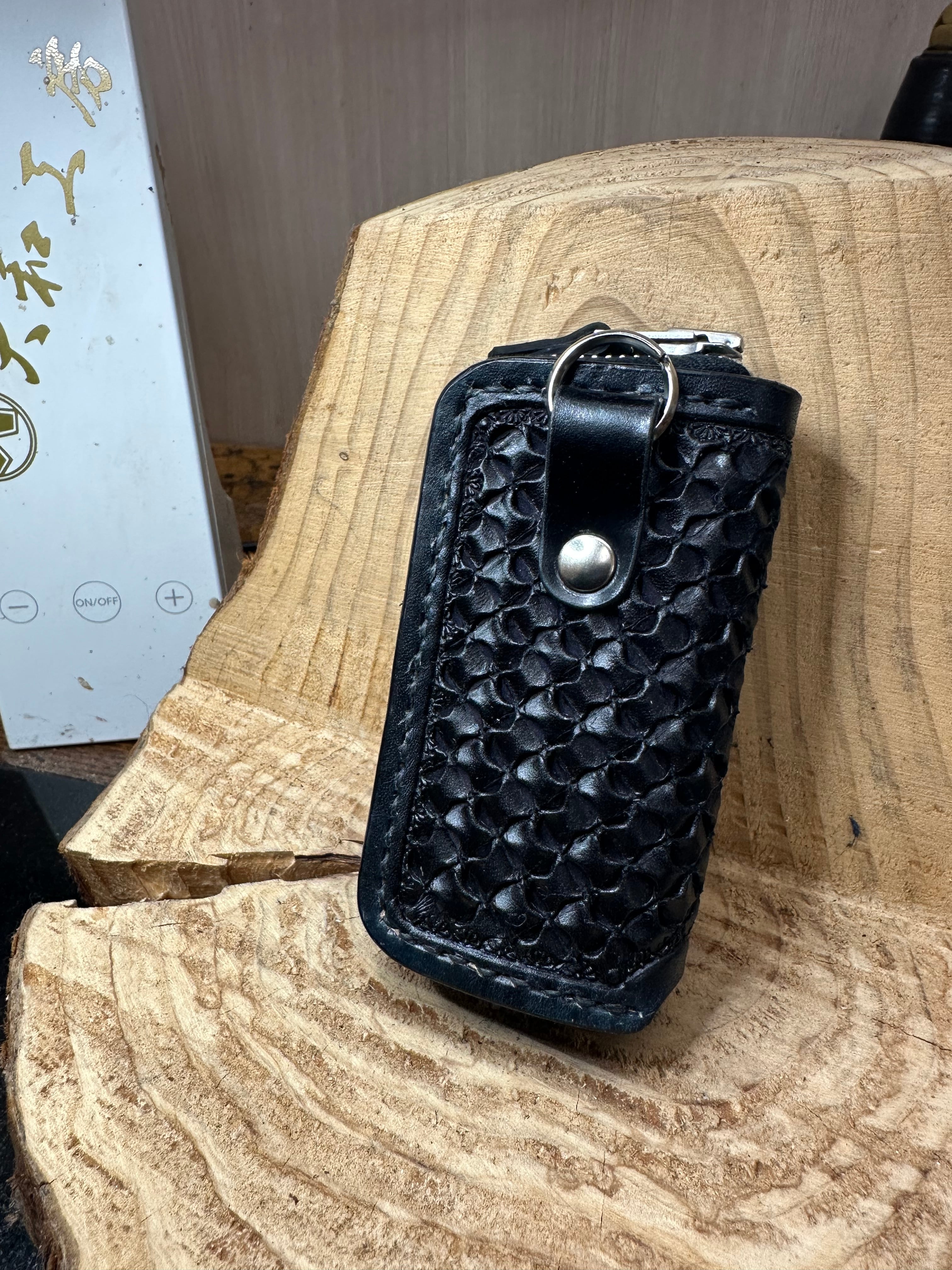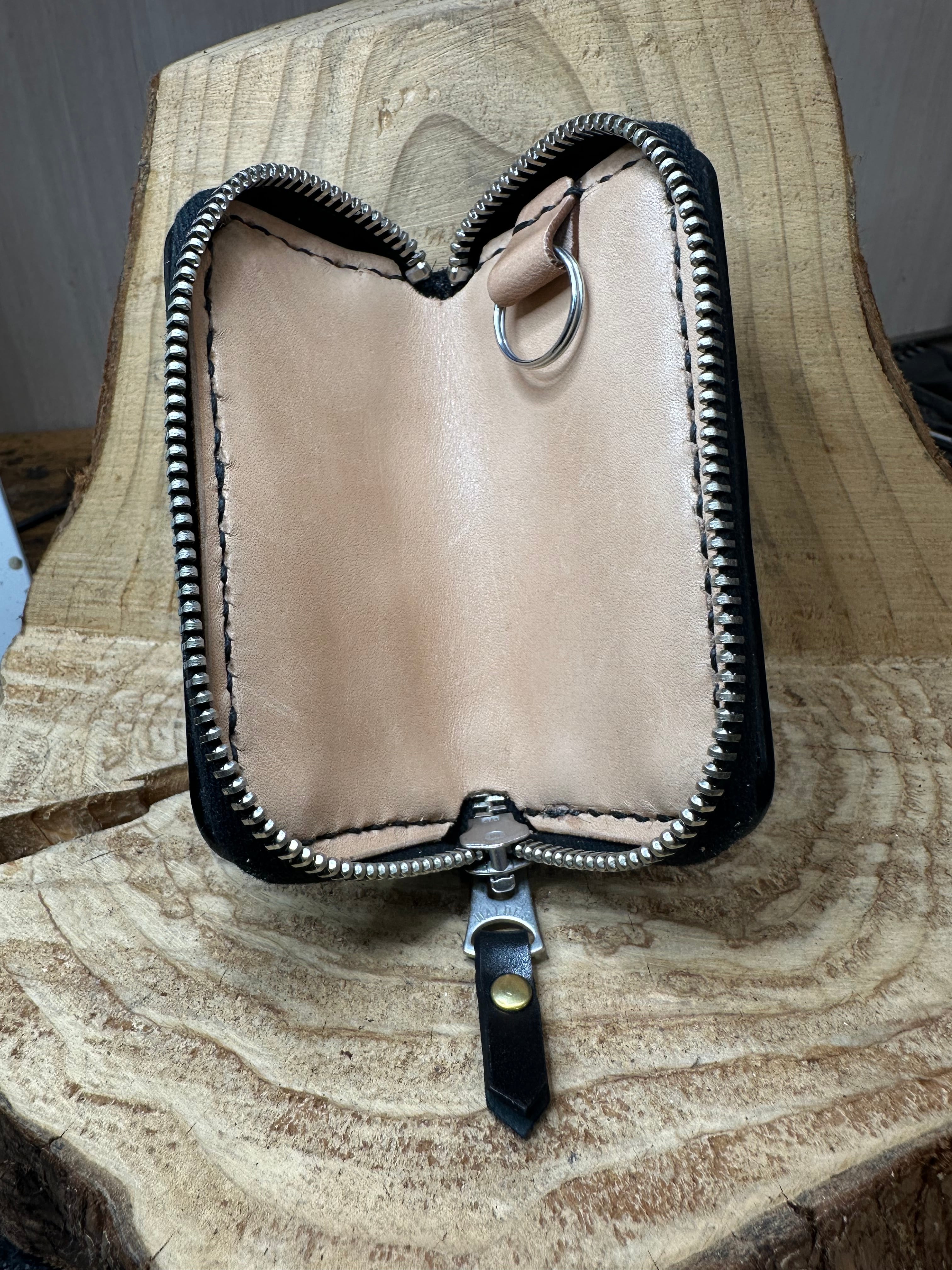 大和工房オリジナルのアンダーカットバスケットの極 ミドルサイズバージョンを彫り込んだスマートキージッパーケースです。
