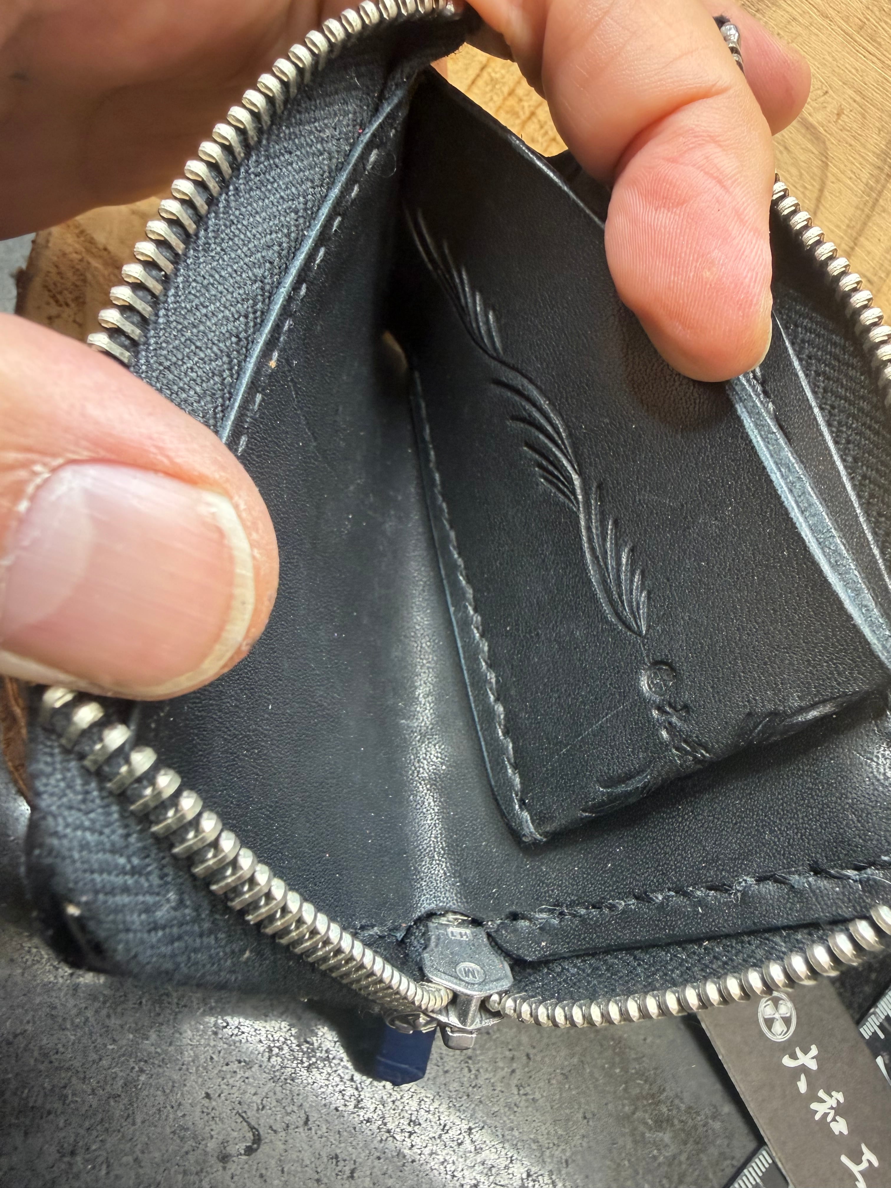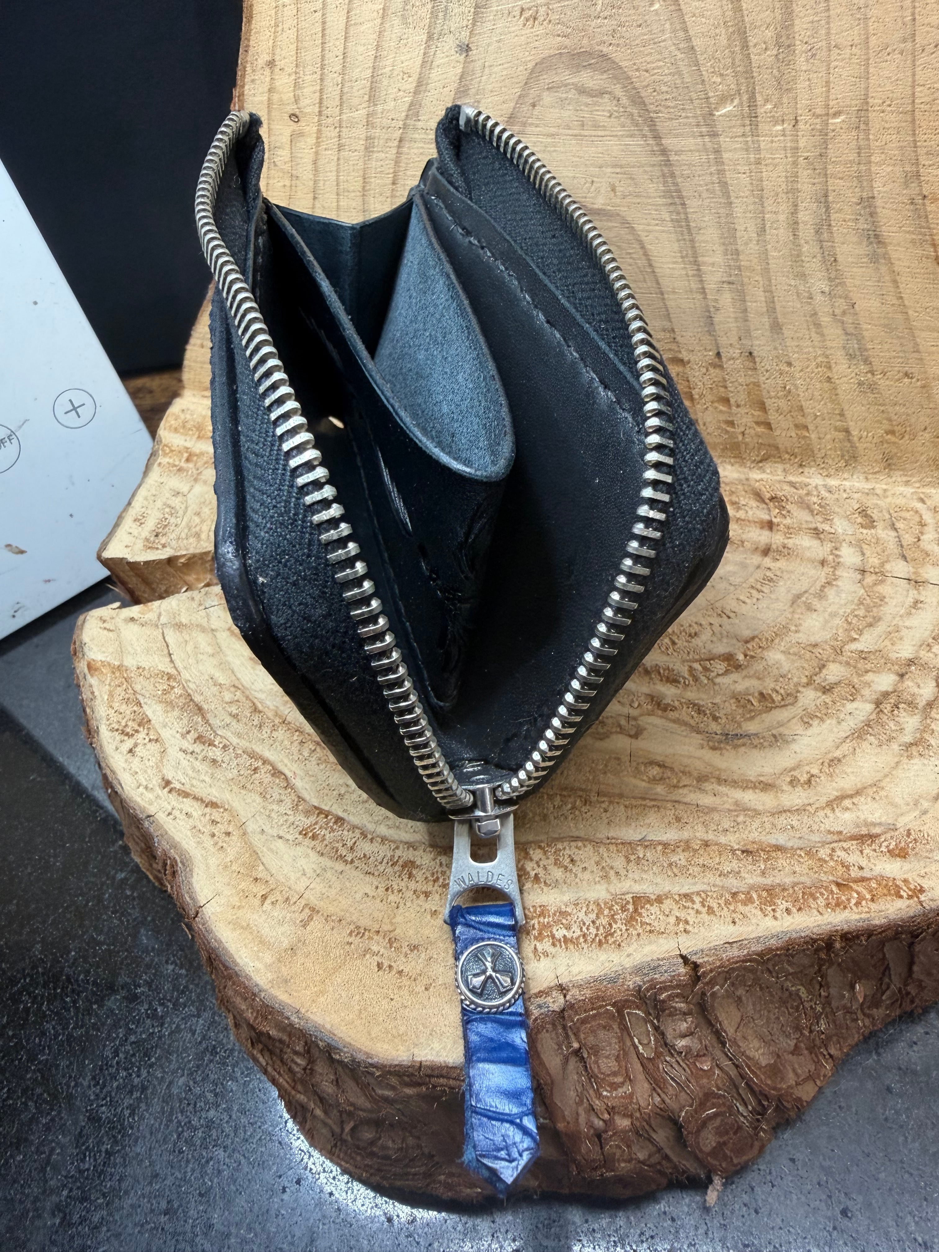 ファスナーストラップ部分にも同個体の藍染スモールクロコダイルを使用し、大和シルバーコンチョにて彩っております。