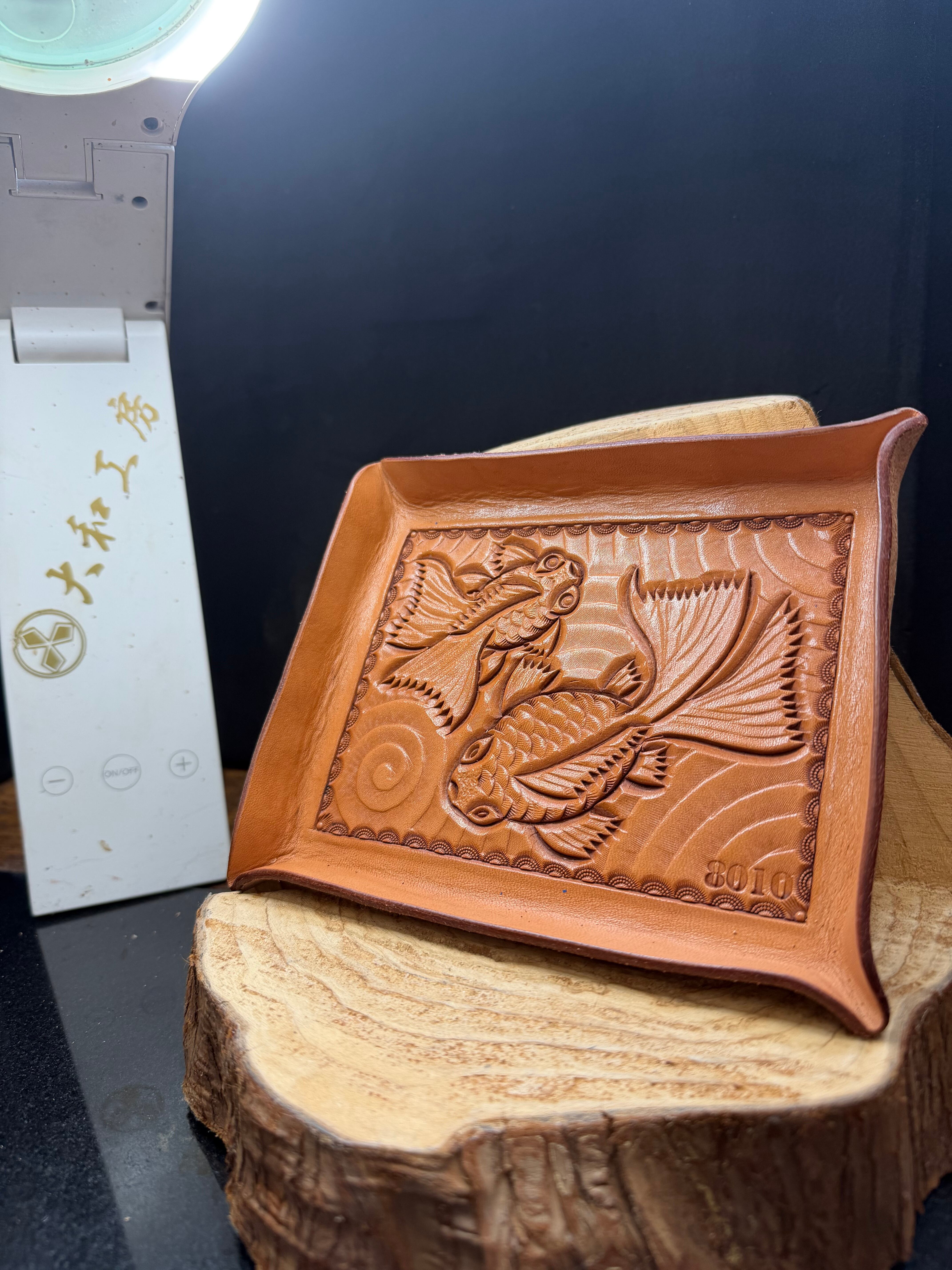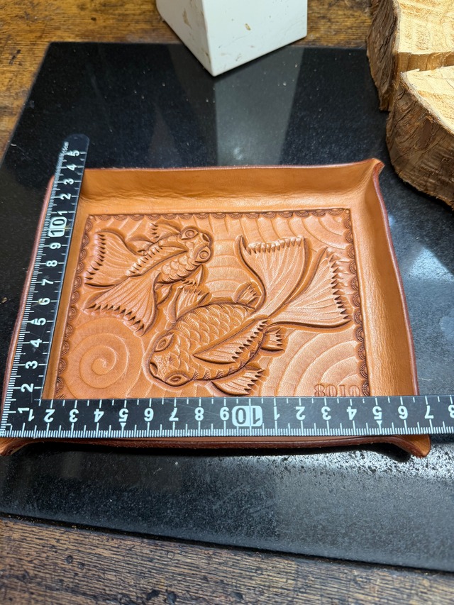 中にはとても大きな金魚、水面を彫り込んでおります。