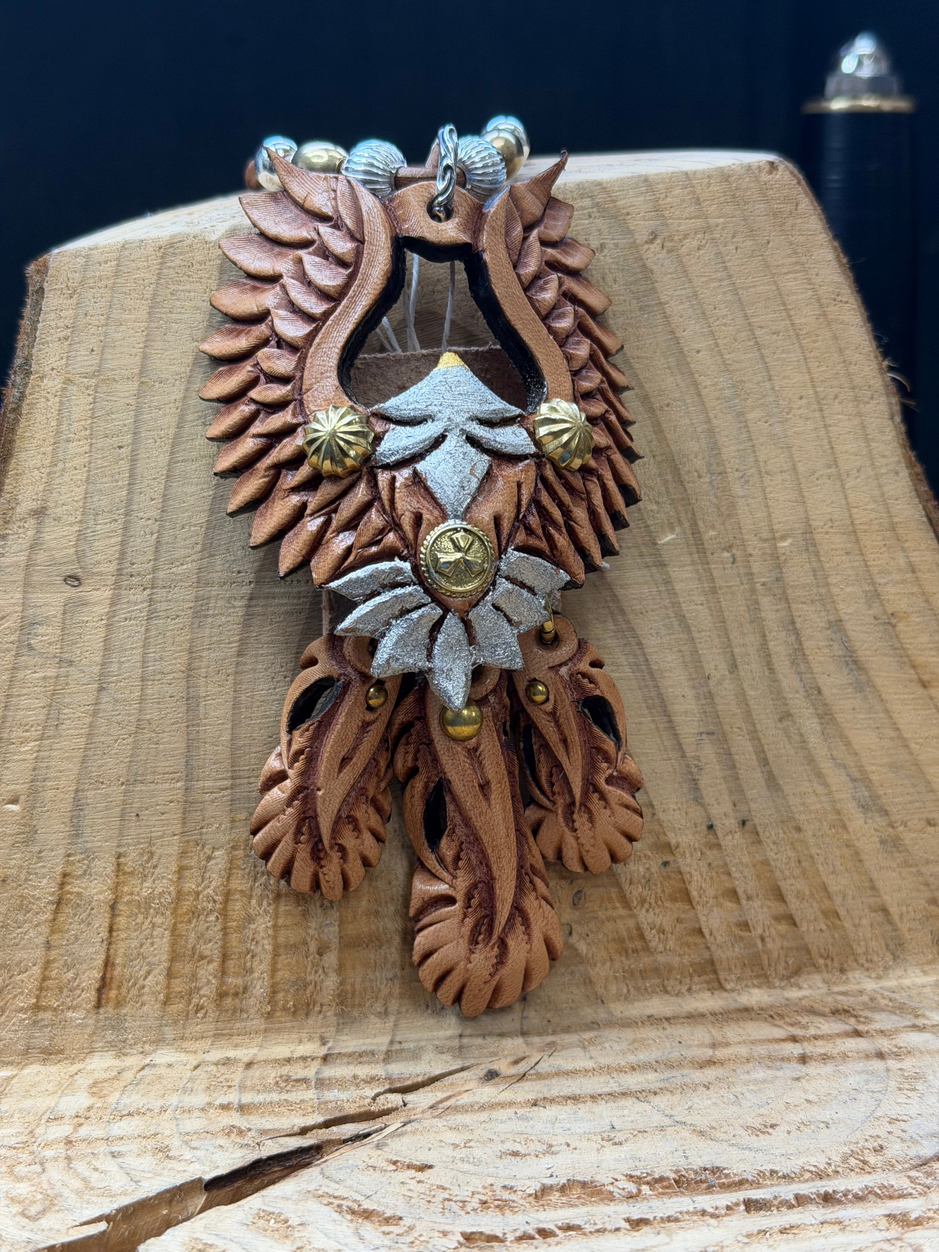 頭はプラチナ箔、くちばし部分には金箔、尾の部分にはプラチナ箔、肩にブラスコンチョ、3枚のフェザーも全てブラススタッズをセットし背中にも大和唐草極小コンチョをセット
