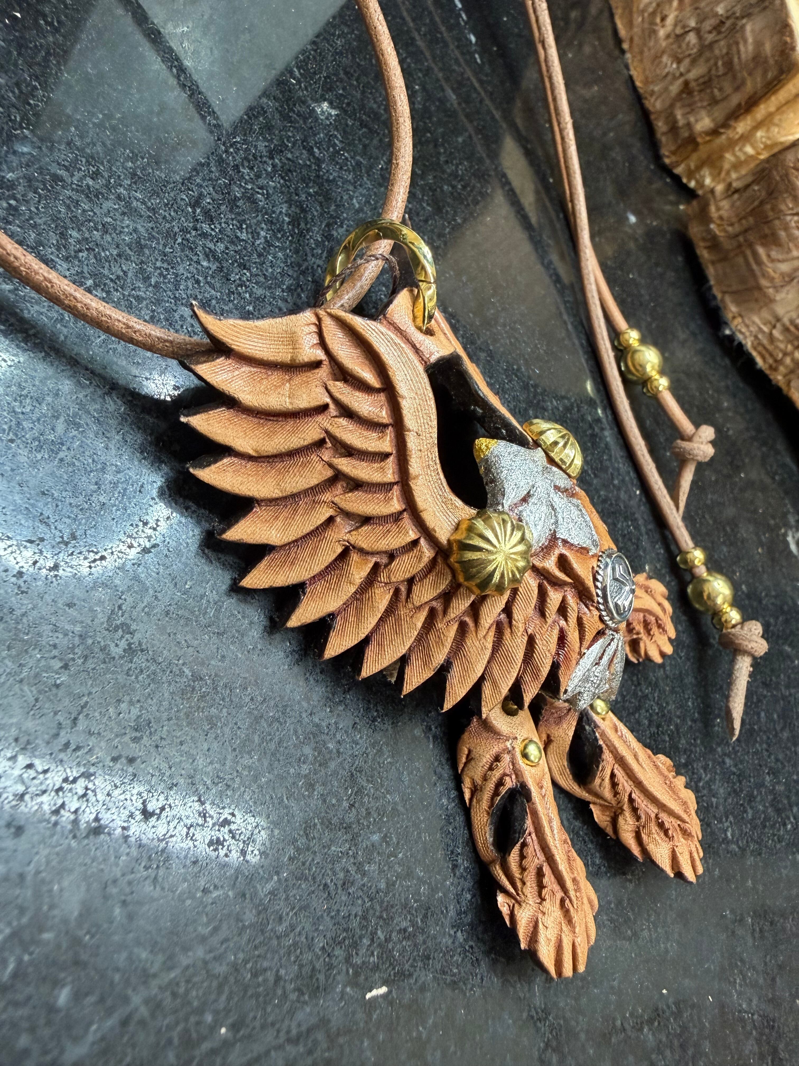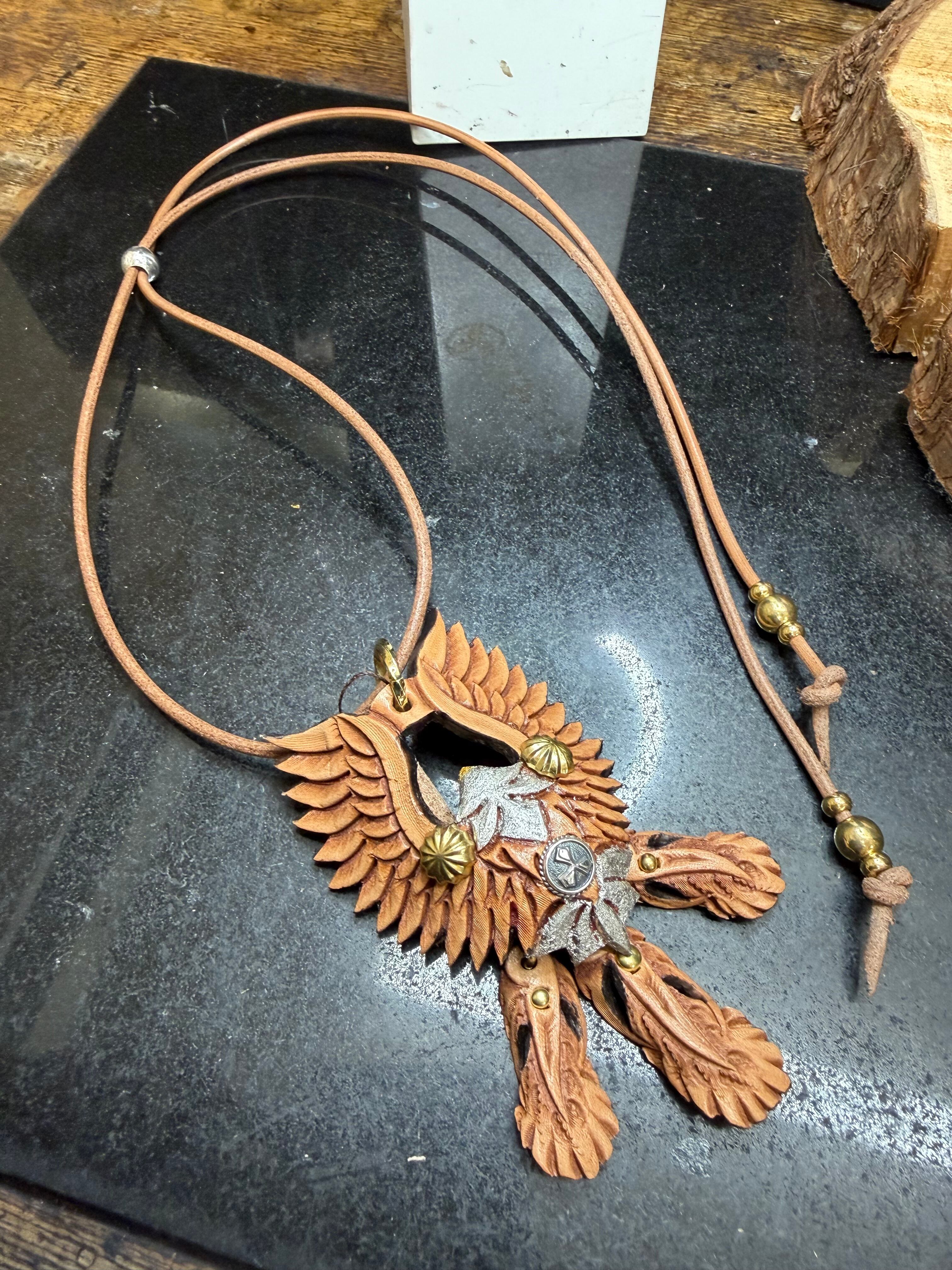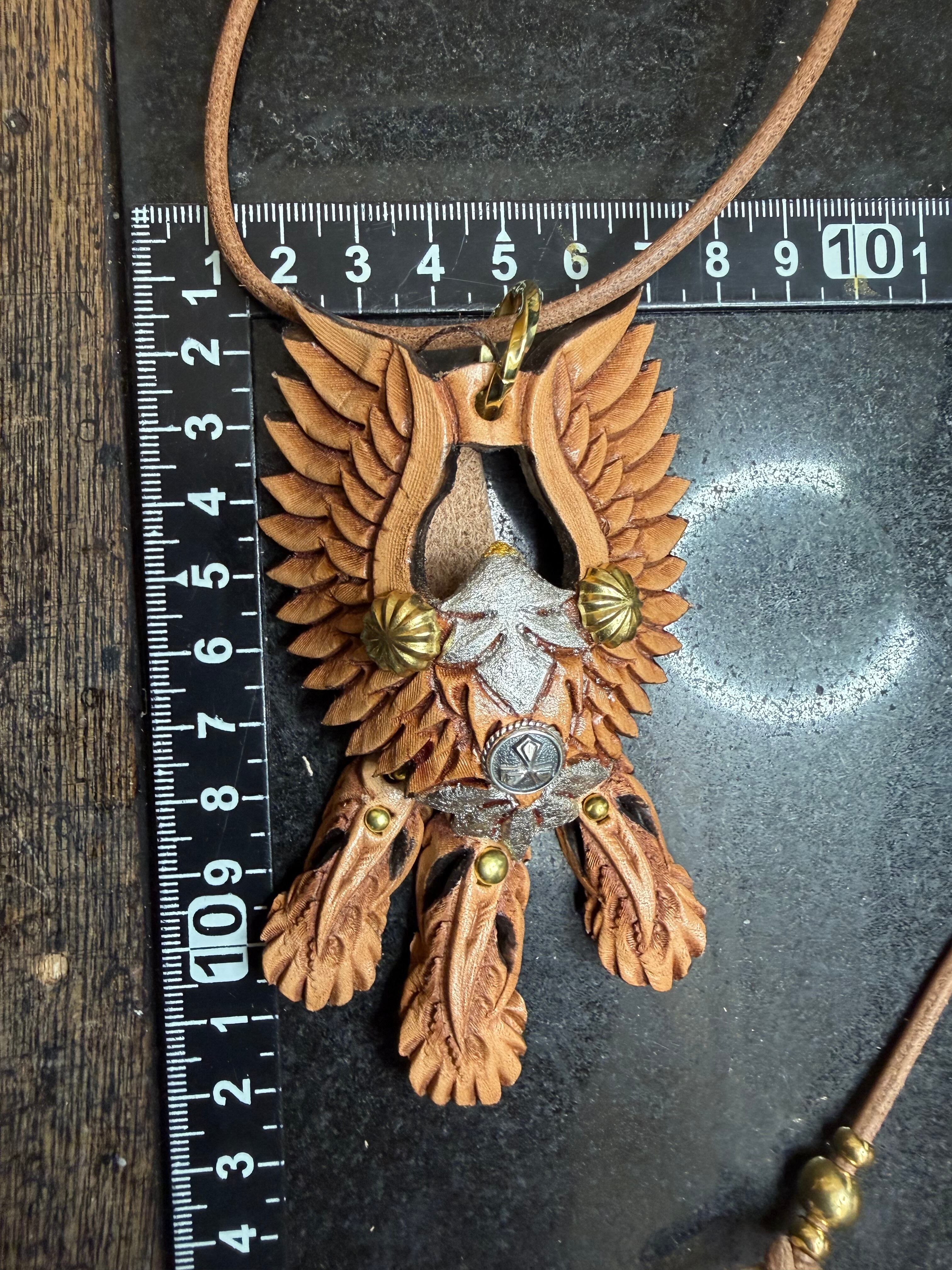 頭はプラチナ箔、くちばし部分には金箔、尾の部分にはプラチナ箔、肩にブラスコンチョ、3枚のミクロフェザーより更に小さなマイクロフェザーも全て真鍮スタッズをセットし背中にはシルバー大和唐草極小コンチョをセット