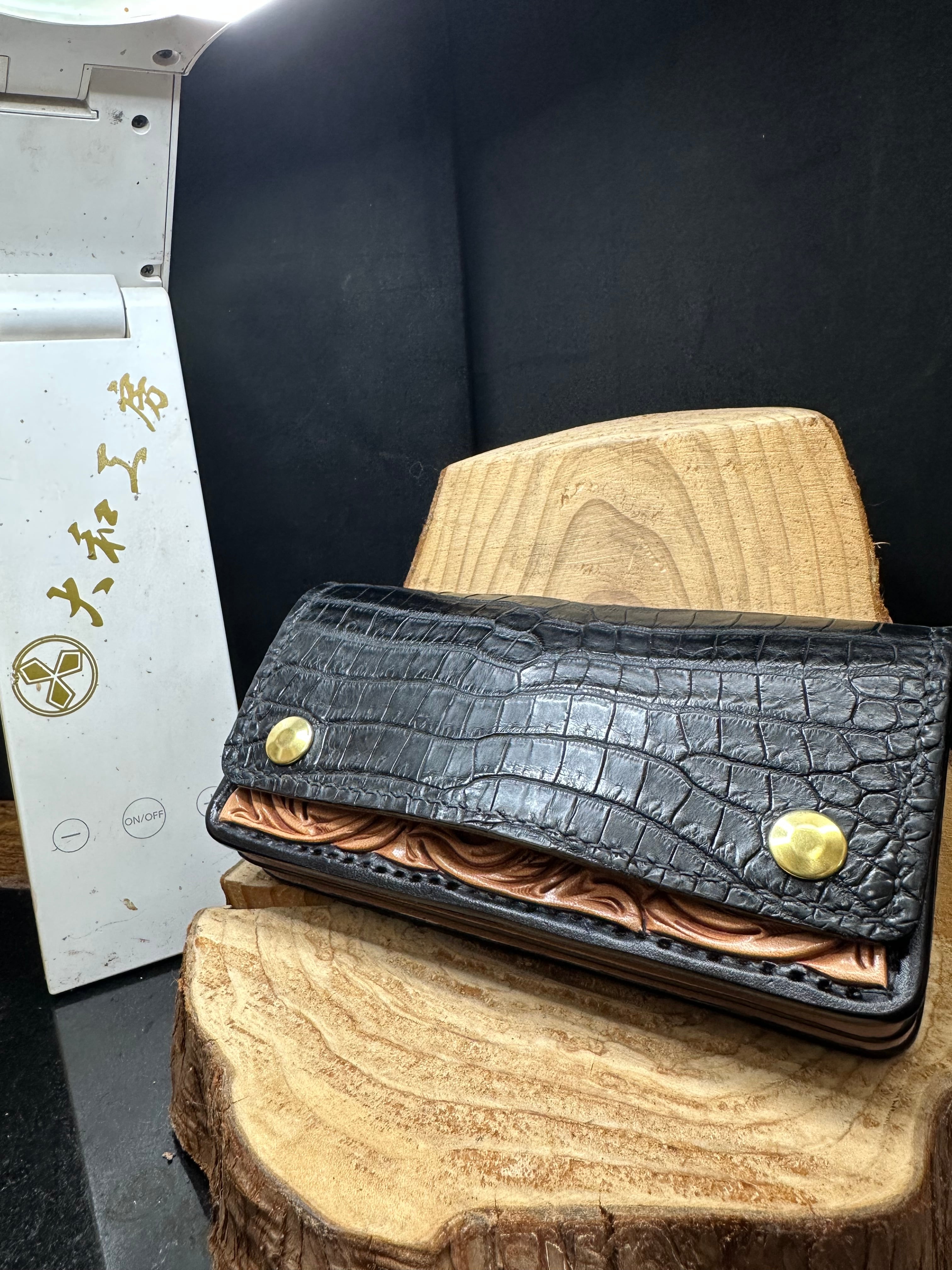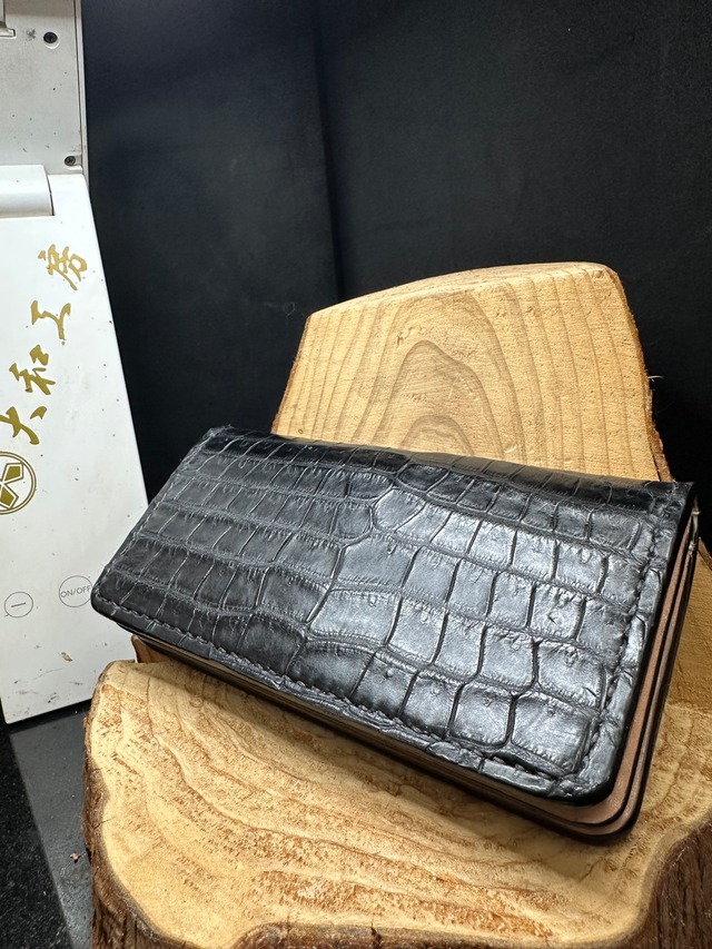 マットブラックのスモールクロコダイルの首部位を贅沢に使用したショートウォレット(トラッカーズウォレット)