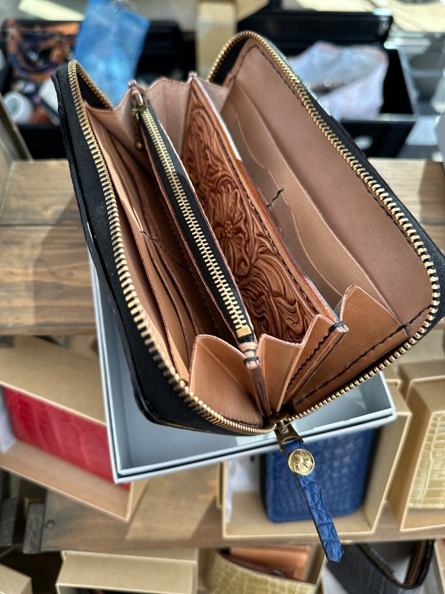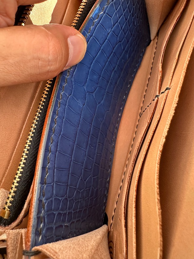 仕切りの裏にまで同個体の藍染スモールクロコダイルを贅沢にセット