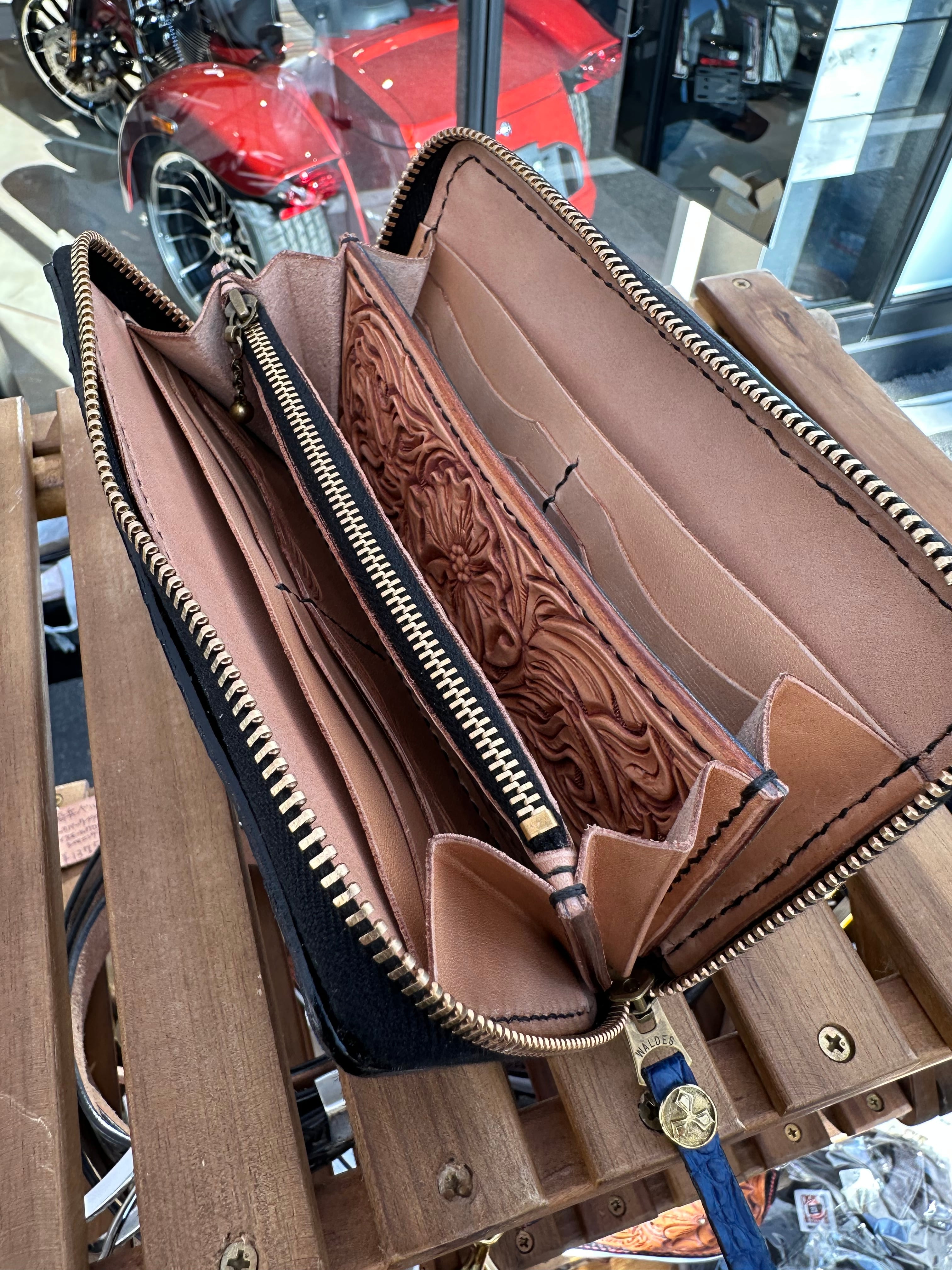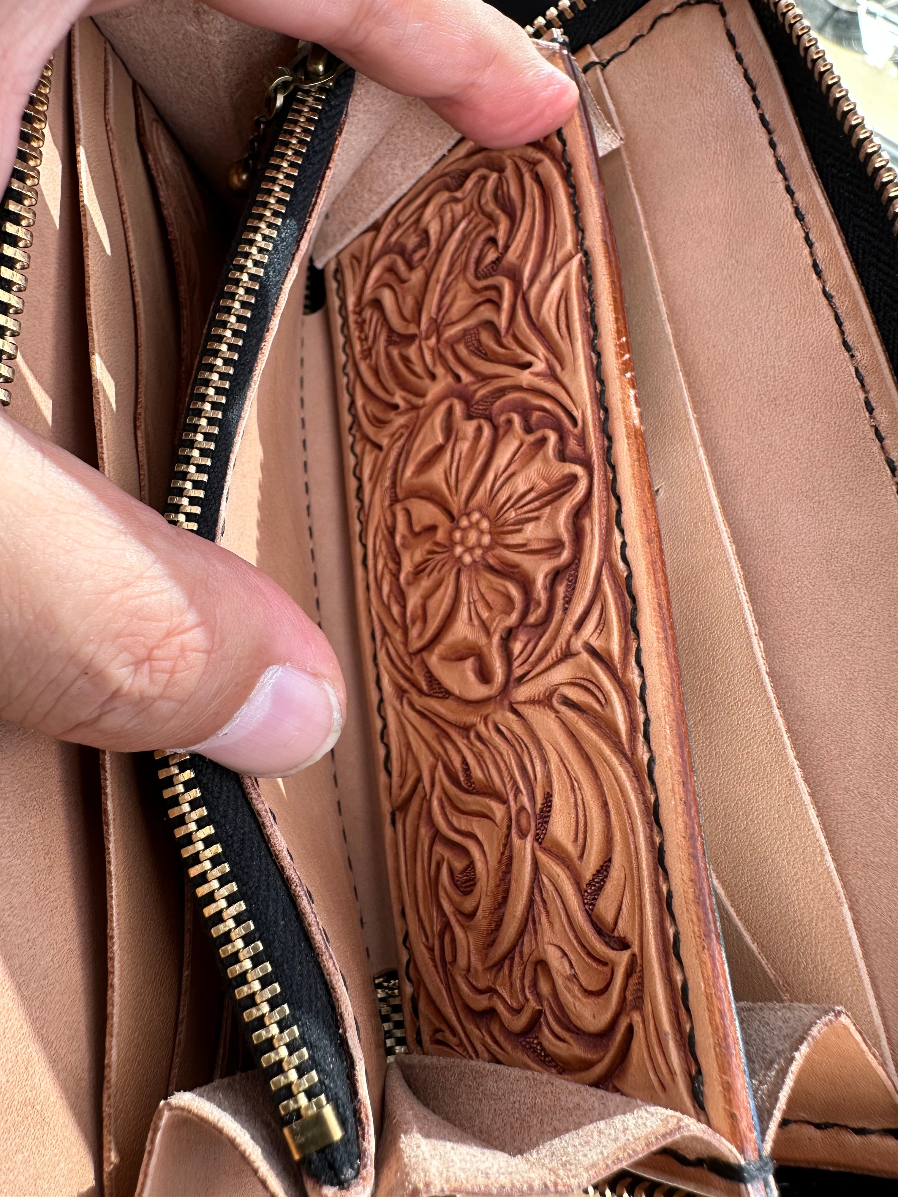 カードケース両サイド前面にナイフにてピンスト唐草を彫り込んでおります。
