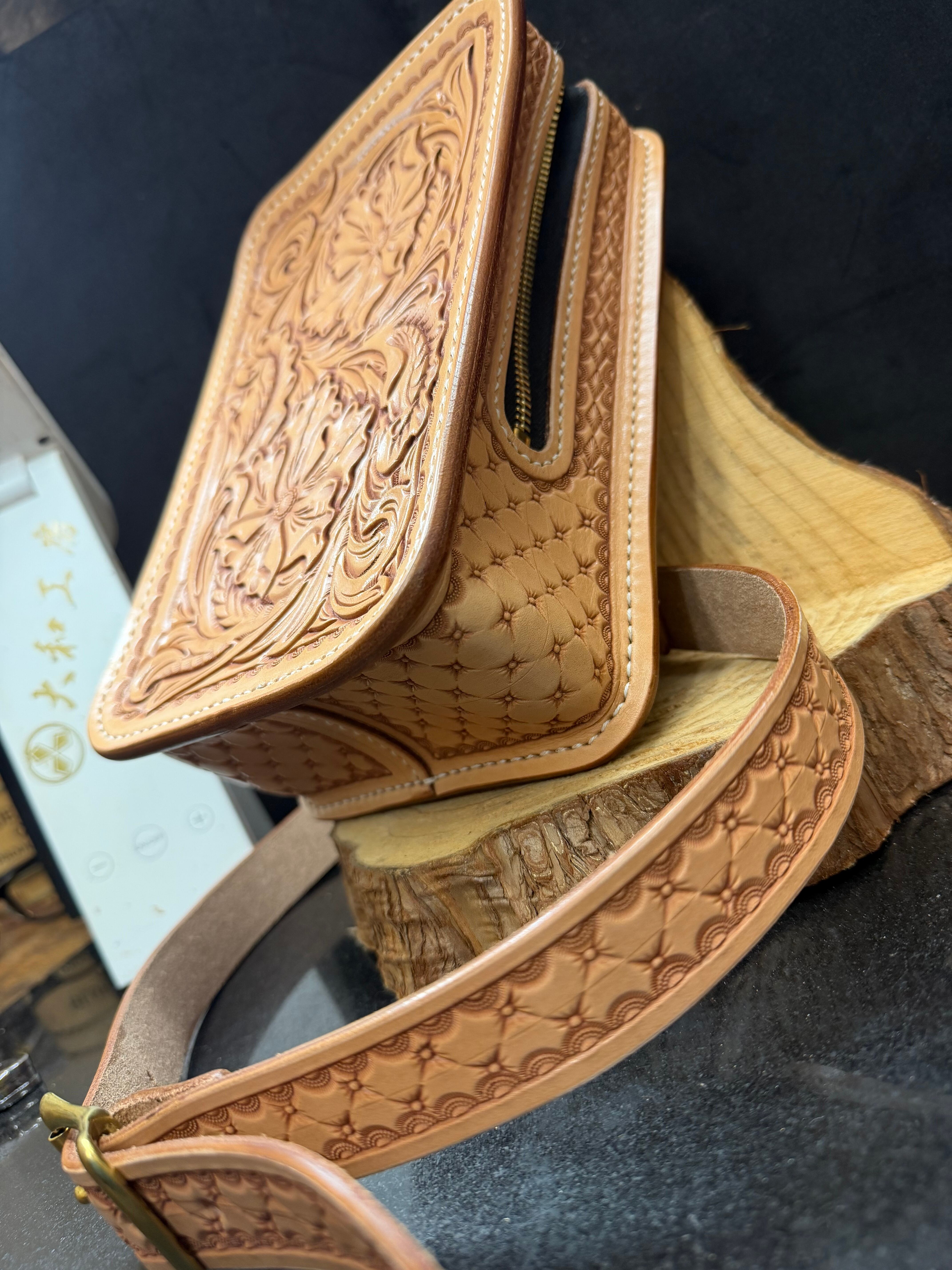 側面そしてショルダー紐へ古き良き時代を彷彿とさせるソファーバスケットを目一杯彫り込み仕上げた極上作品。